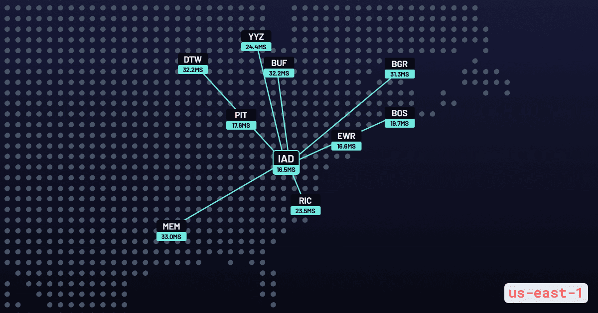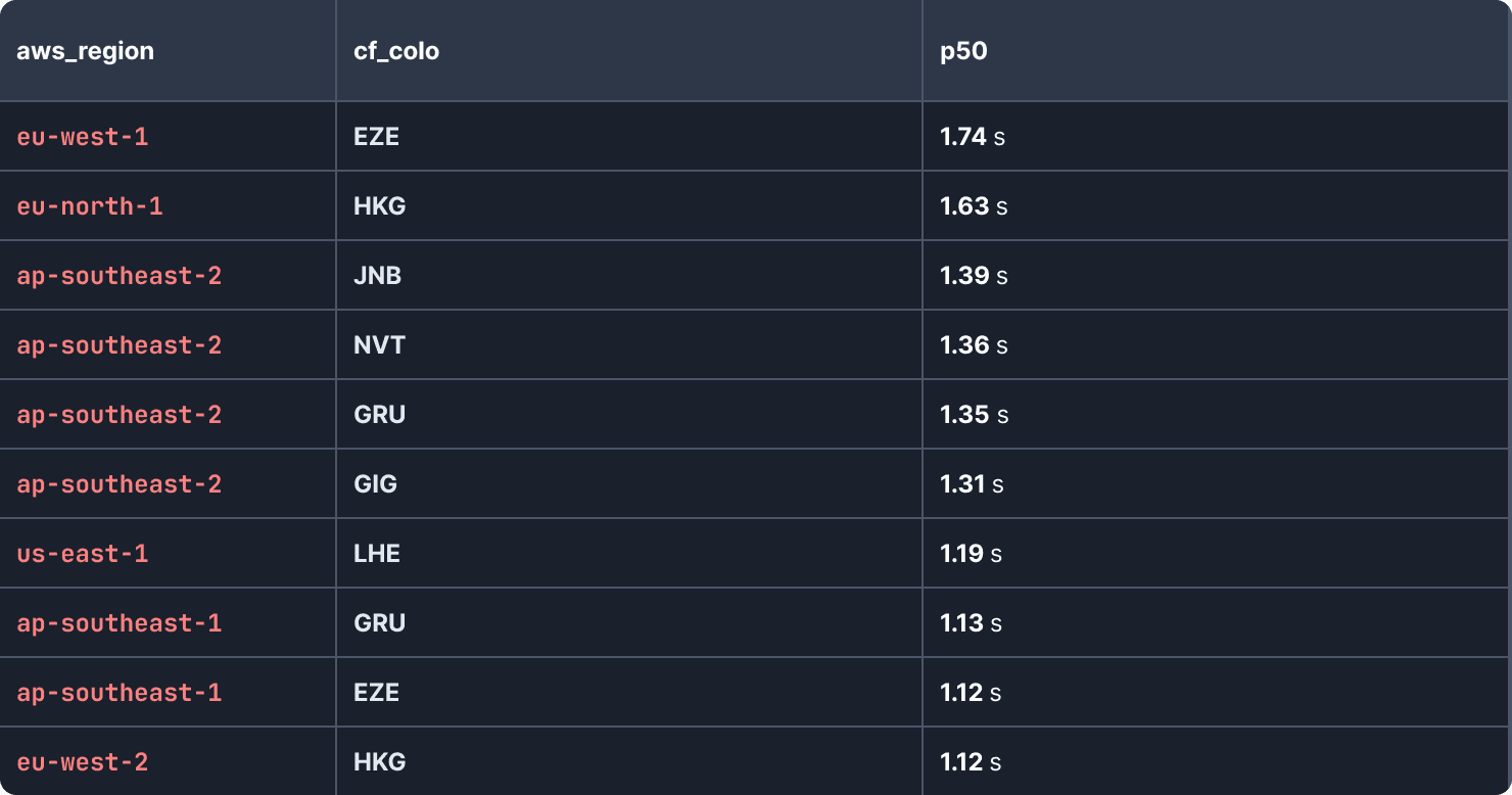 Prisma Accelerate is a global database cache, increasing the performance of websites that are deployed in multiple regions and communicating with a central database. As such, we see traffic from almost all Cloudflare PoPs to any given AWS region. These are the AWS region and Cloudflare PoP pairs where we observe the highest latency: