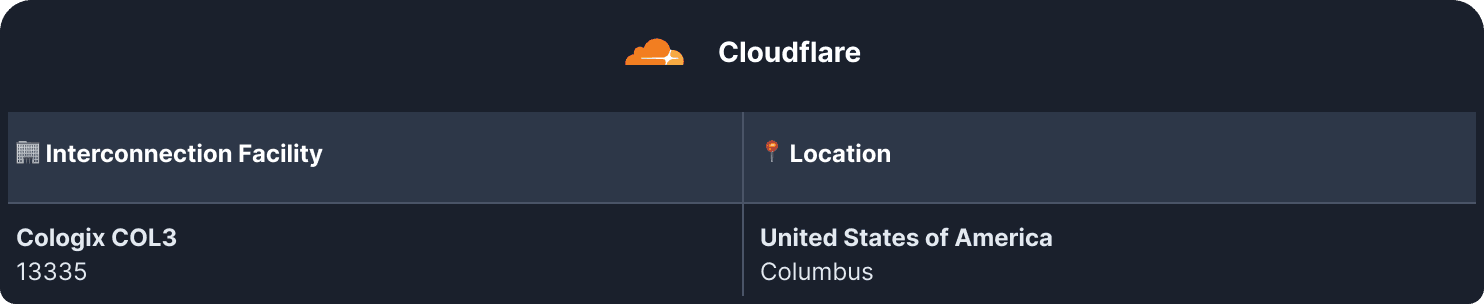 Cloudflare also has a PoP in Columbus, but it is peering at a different Cologix facility, resulting in additional network hops: