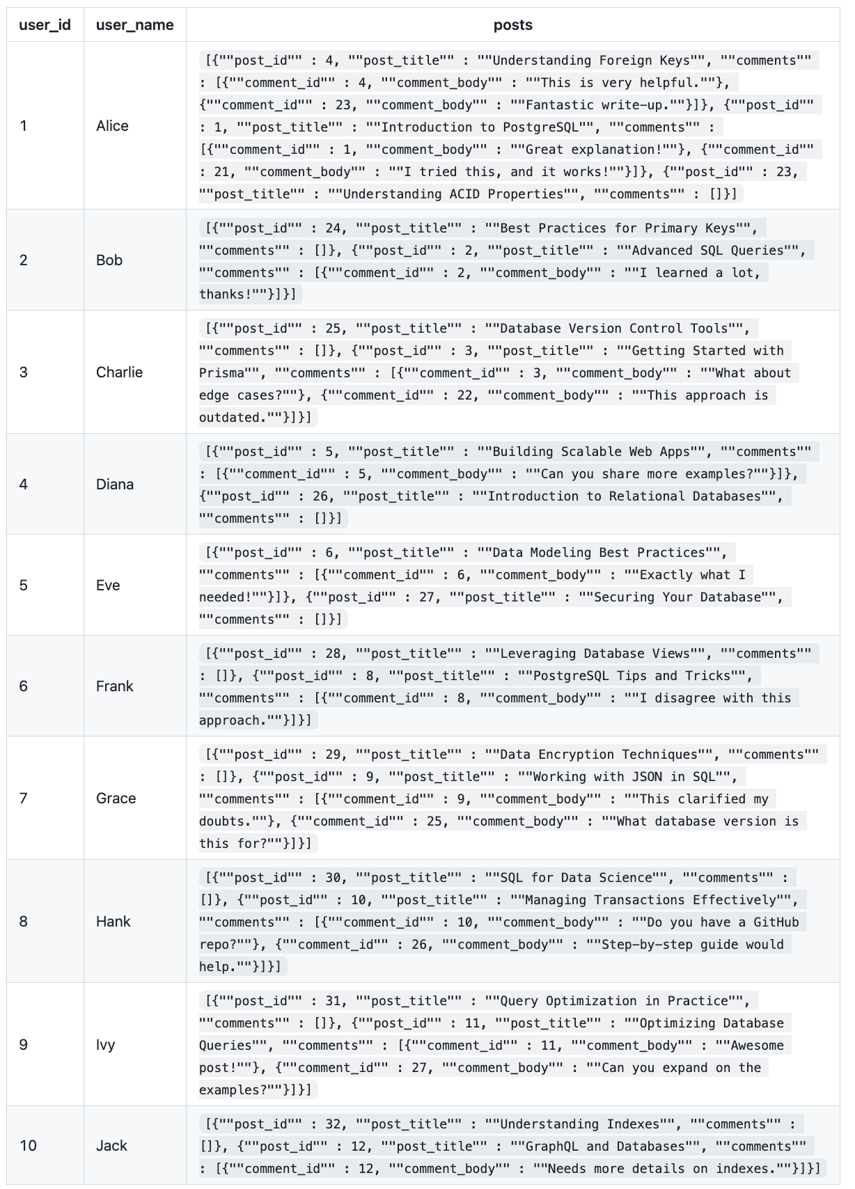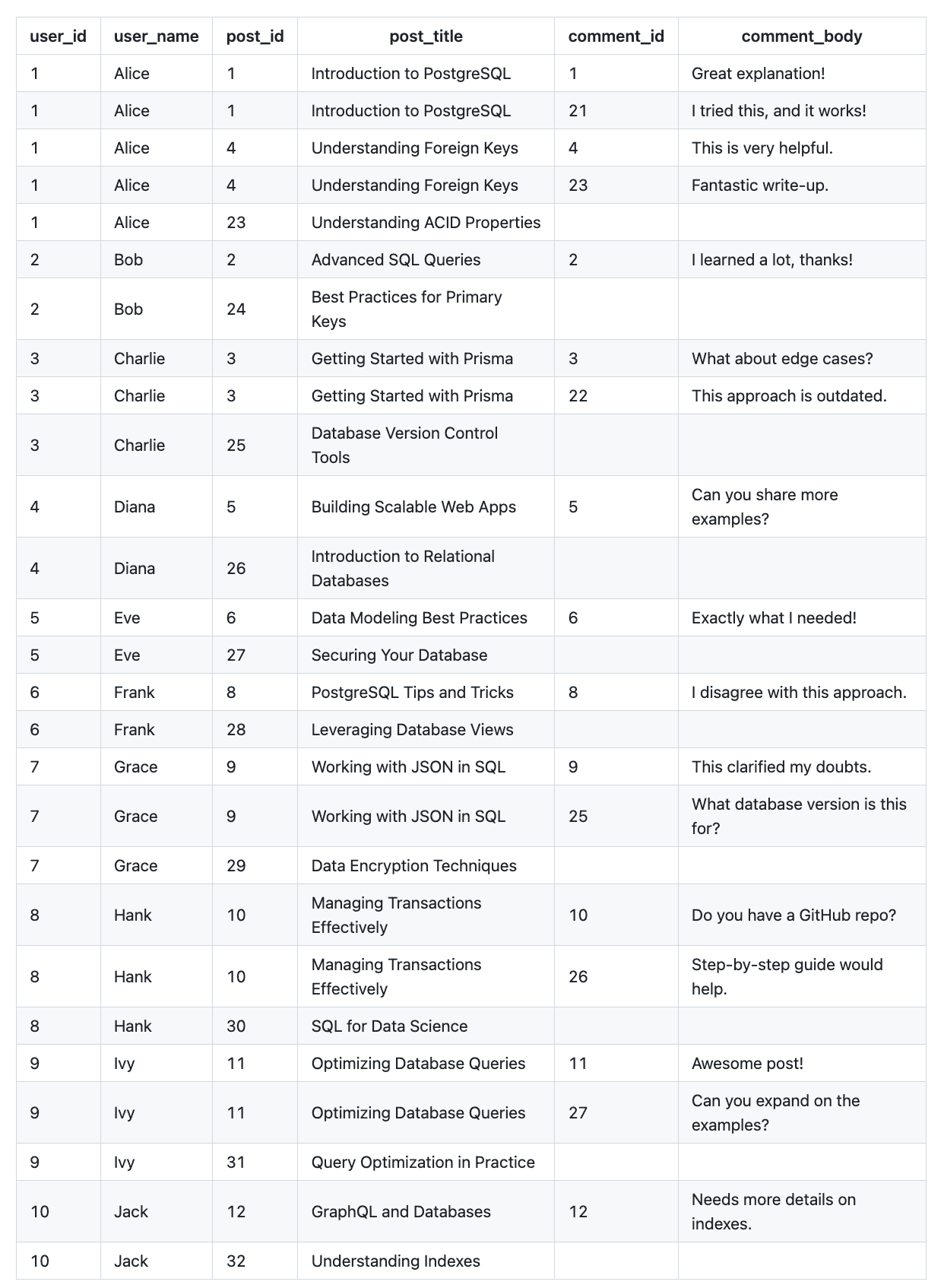 For example, here's a simple LEFT JOIN operation that a developer may naively write to join the data from the users and post tables: