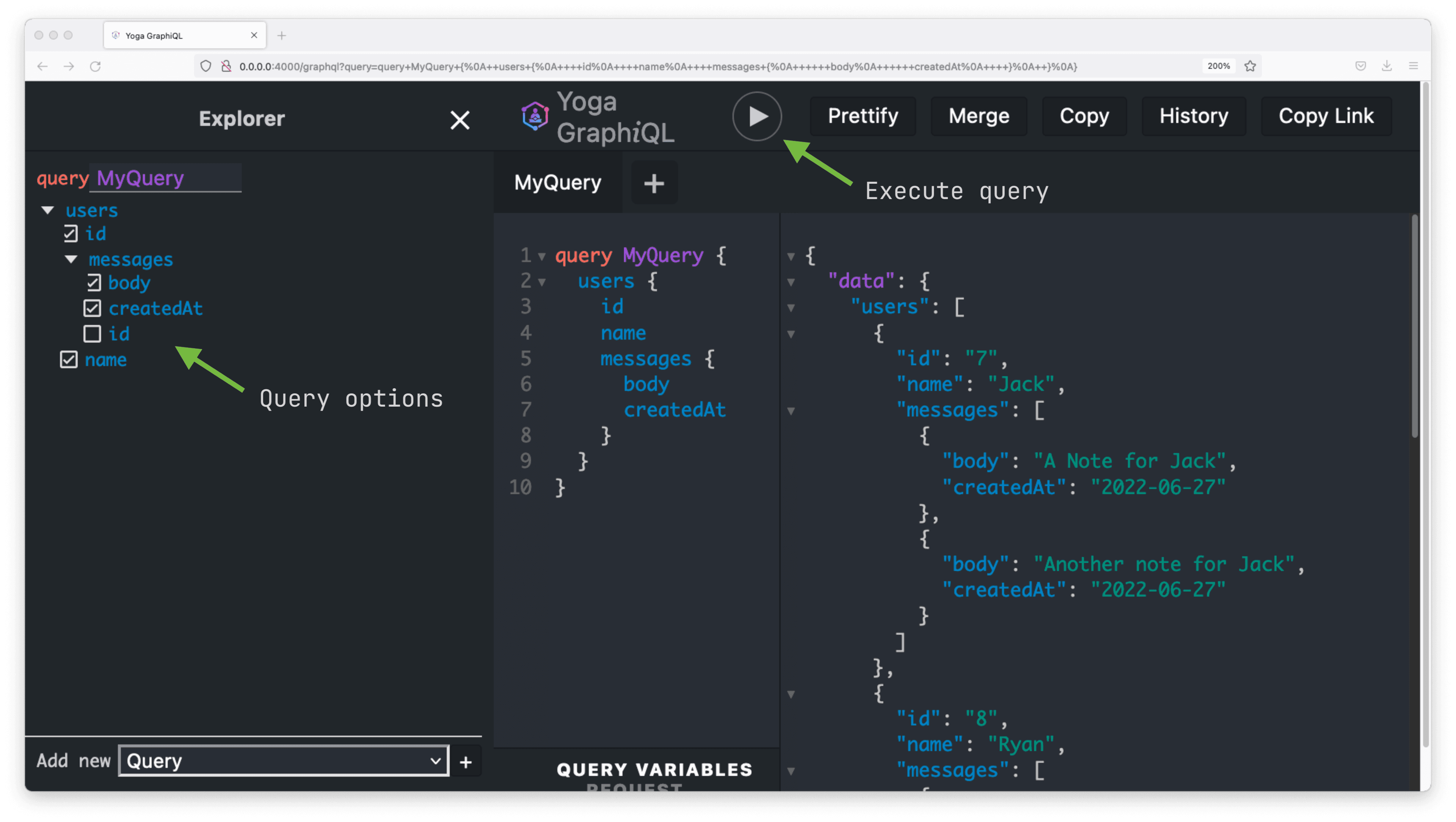 Feel free to play around with the different options to choose which fields you would like to query for and which data from the "messages" relation you would like to include.