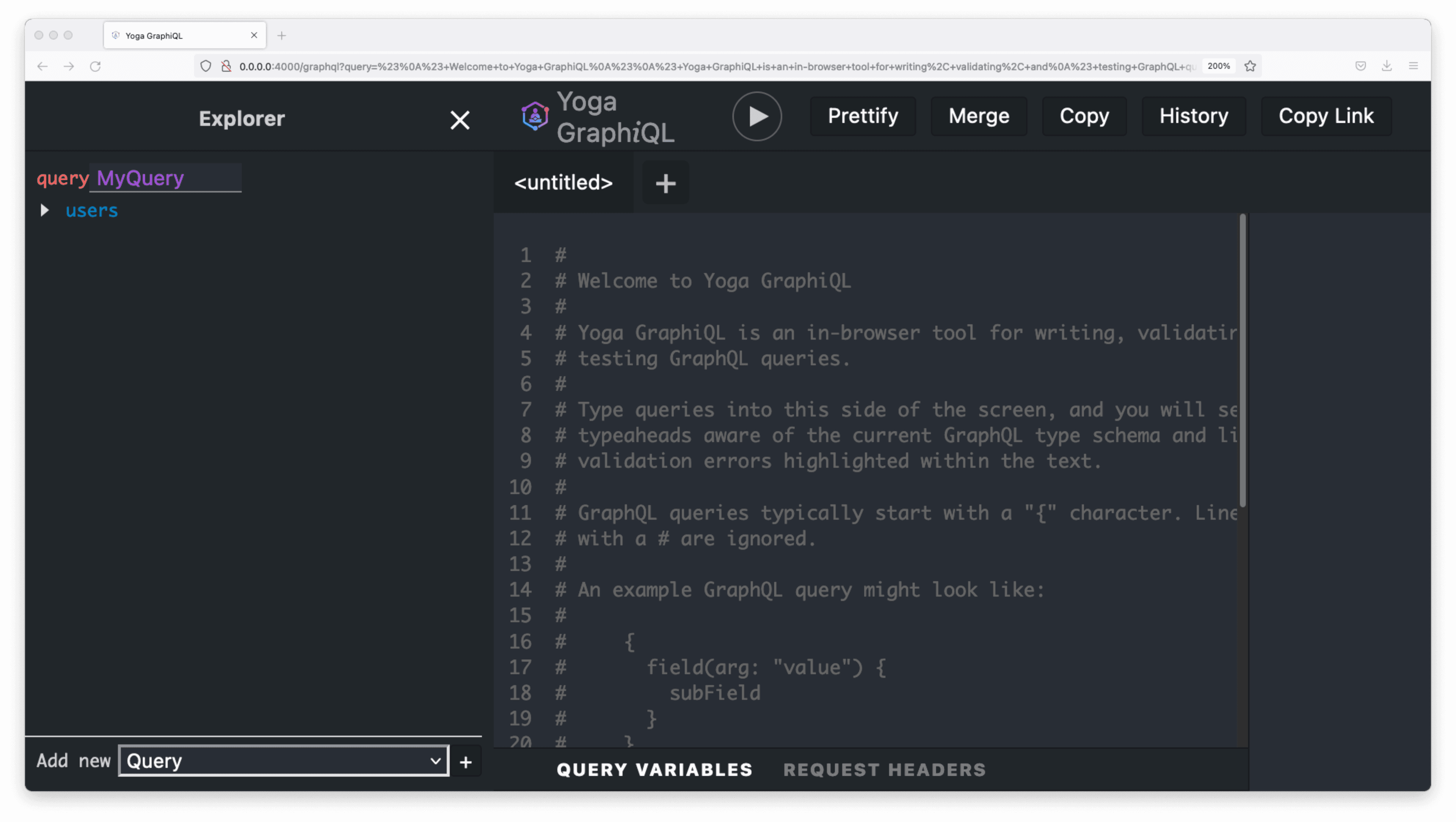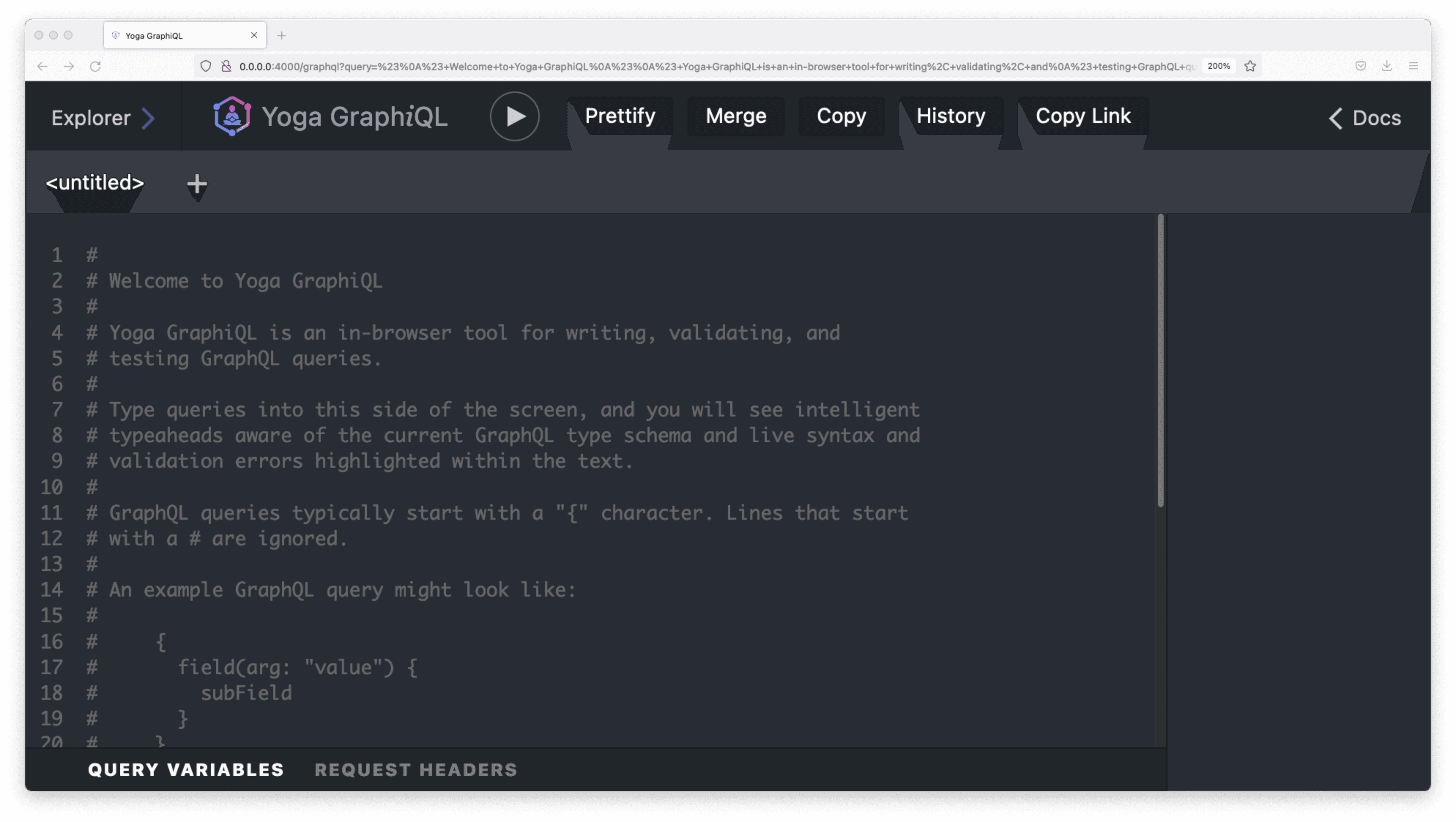 After running the above command, open up http://localhost:4000/graphql in your browser to access the GraphQL playground. You should be presented with a page that looks like this: