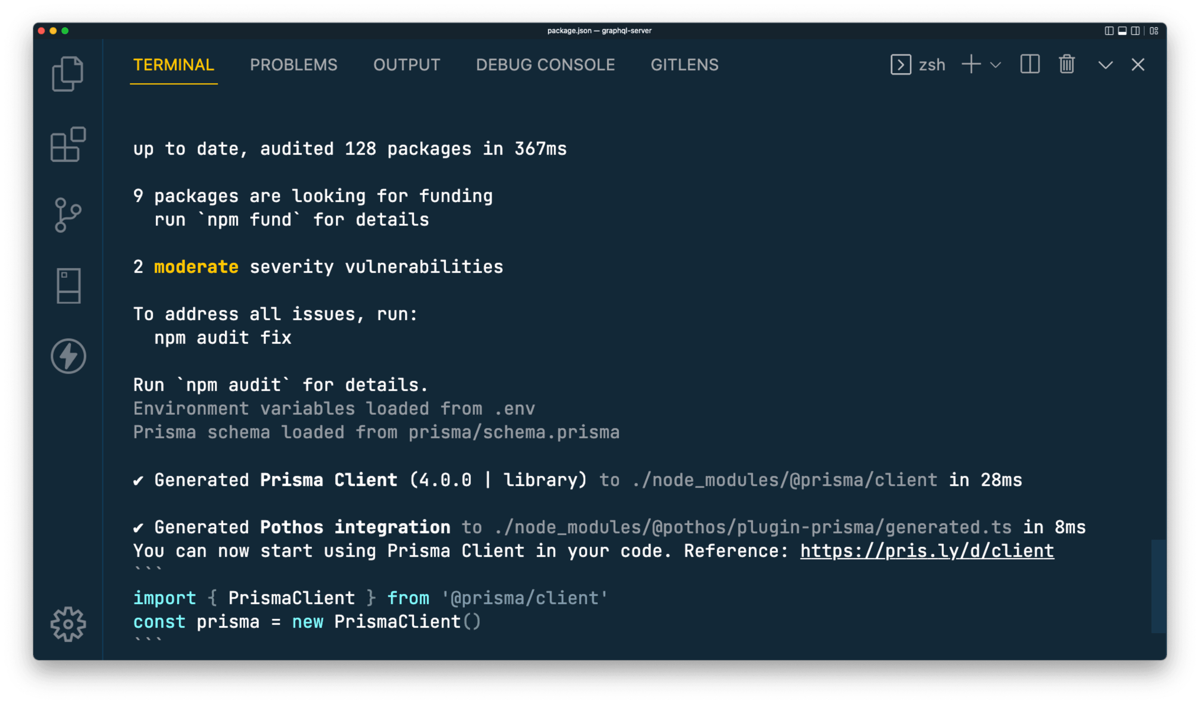 The Pothos Prisma plugin is now completely configured and ready to go. This takes the types generated by Prisma and allows you easy access to those within your GraphQL object types and queries.