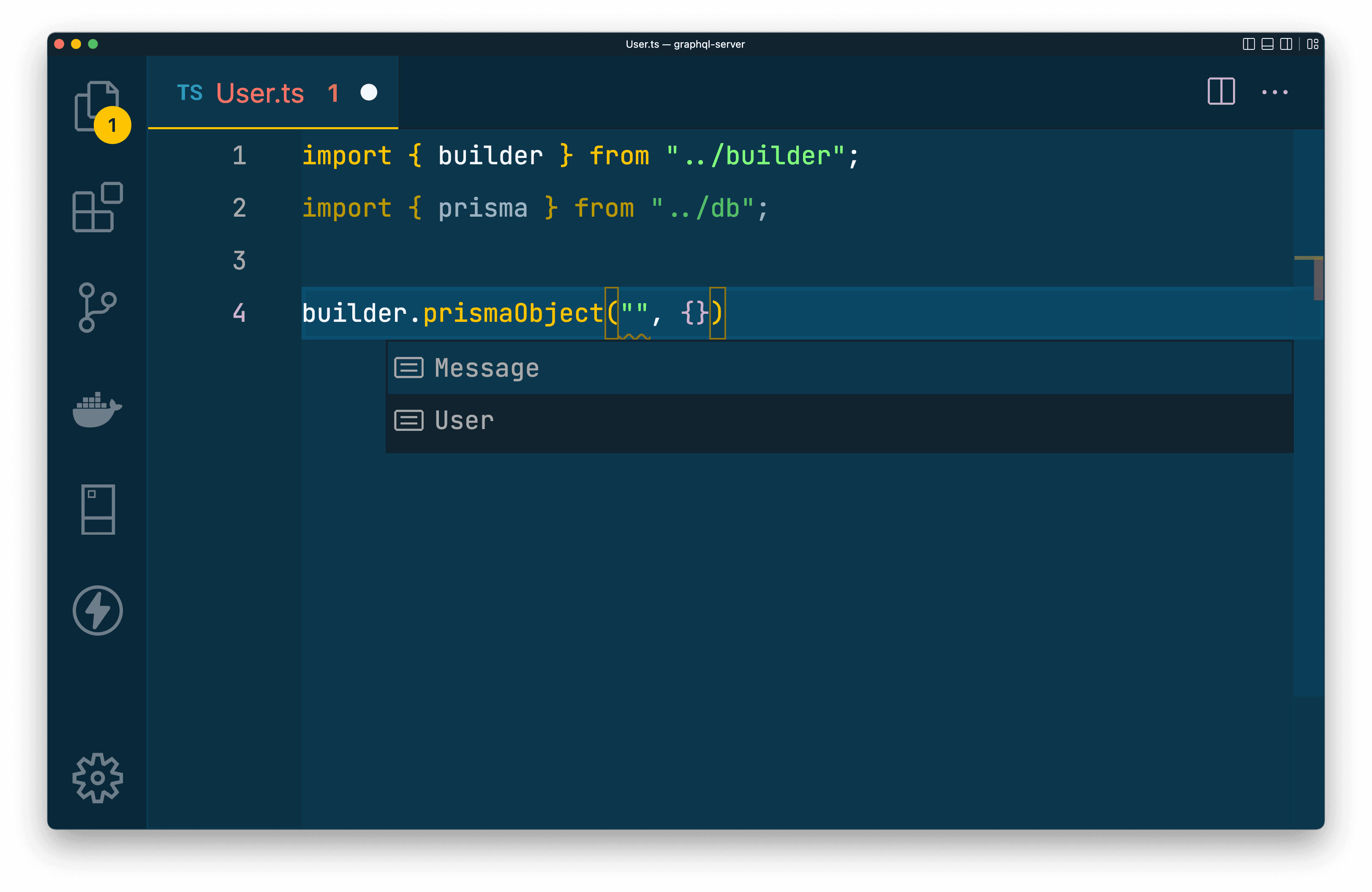 This is where you will define the User object type and its related queries that you will expose through your GraphQL API. Import the builder instance: