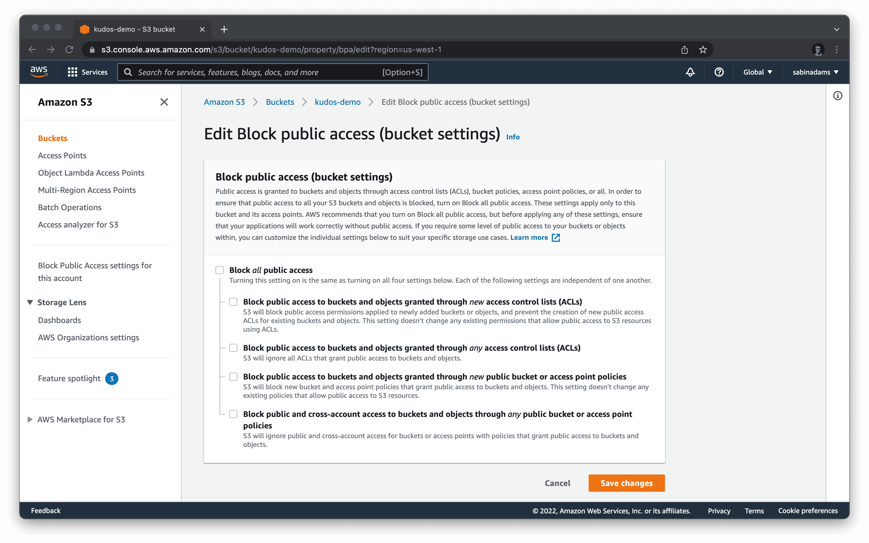 In this tab, hit the Edit button under the Block public access section. In this form, uncheck the Block all public access box and hit Save changes. This sets your bucket as public, which will allow your application to access the images.