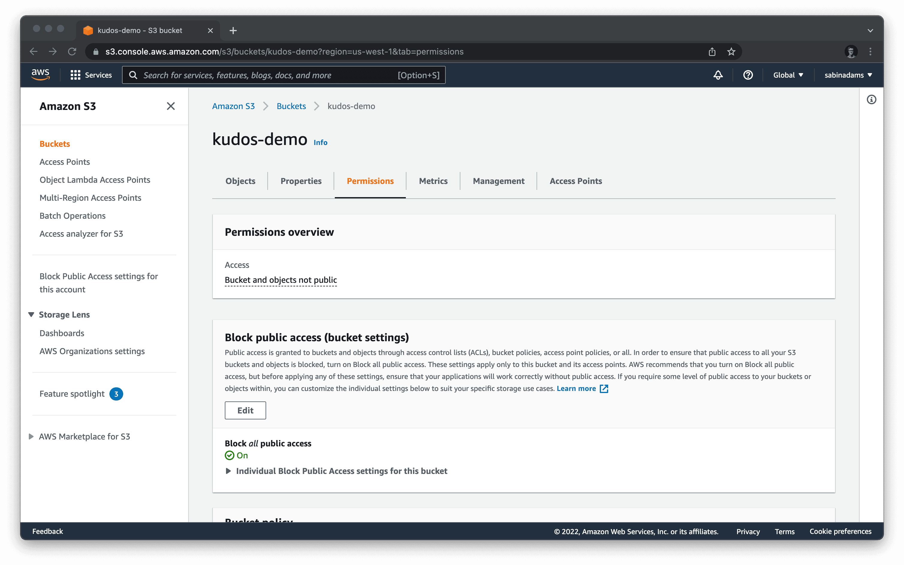 When the bucket is done being created, you will be sent to the bucket's dashboard page on the Objects tab. Navigate to the Permissions tab.