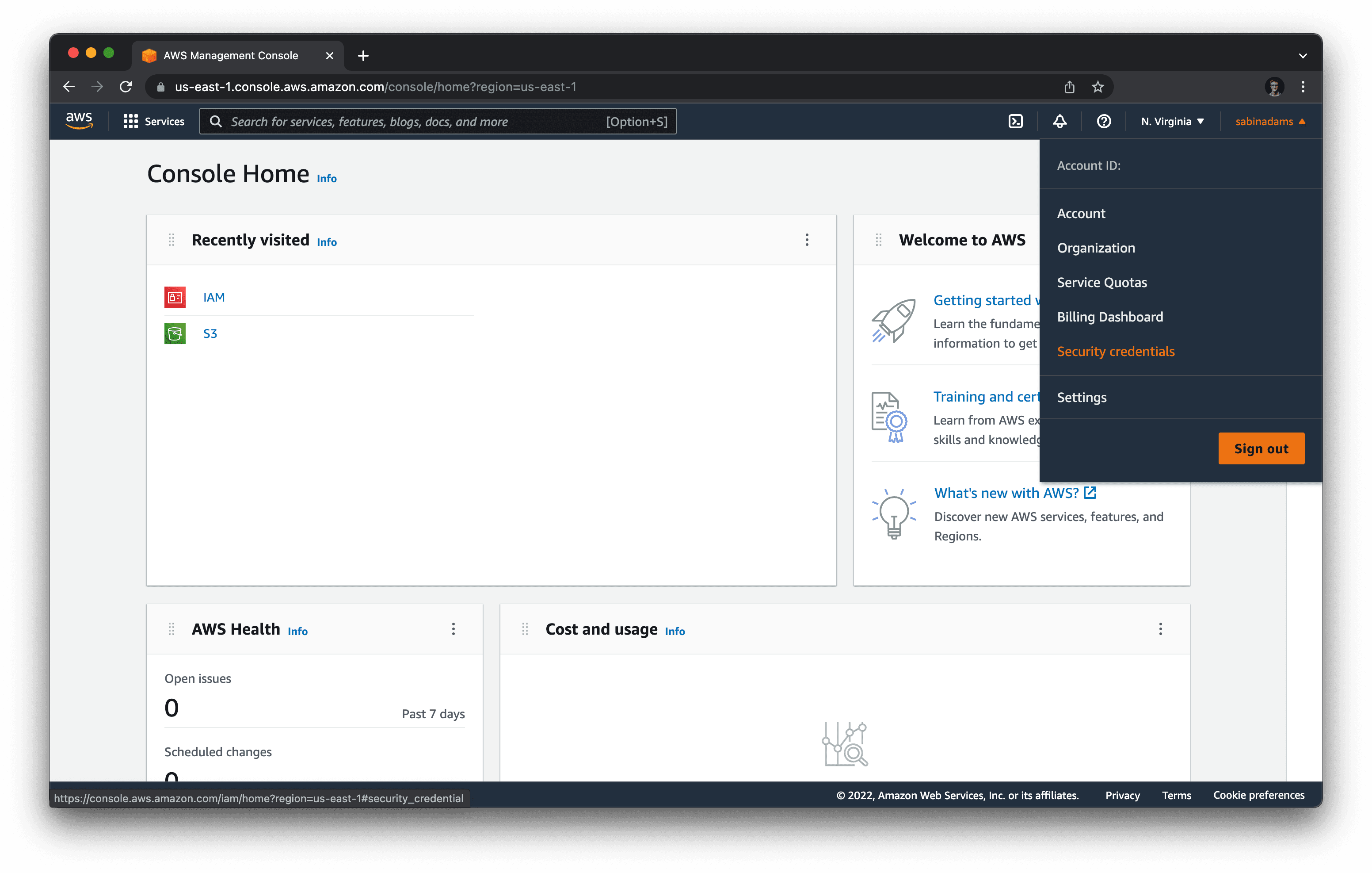 Head over to to the AWS console home page. On the top right corner of the page, click on the dropdown labeled with your user name and select Security Credentials.