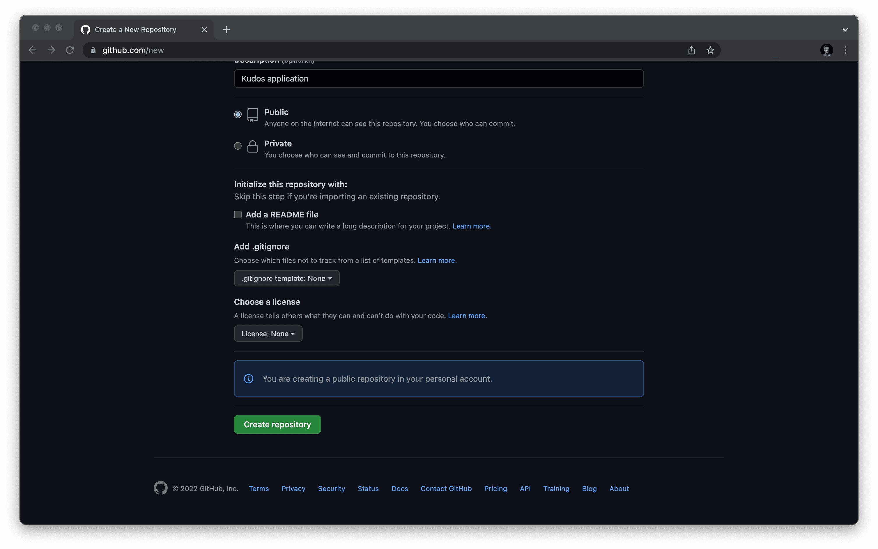 That will take you a page where you are asked for some details and options to configure about the repository. Fill those out however you would like and hit the Create repository button at the bottom.