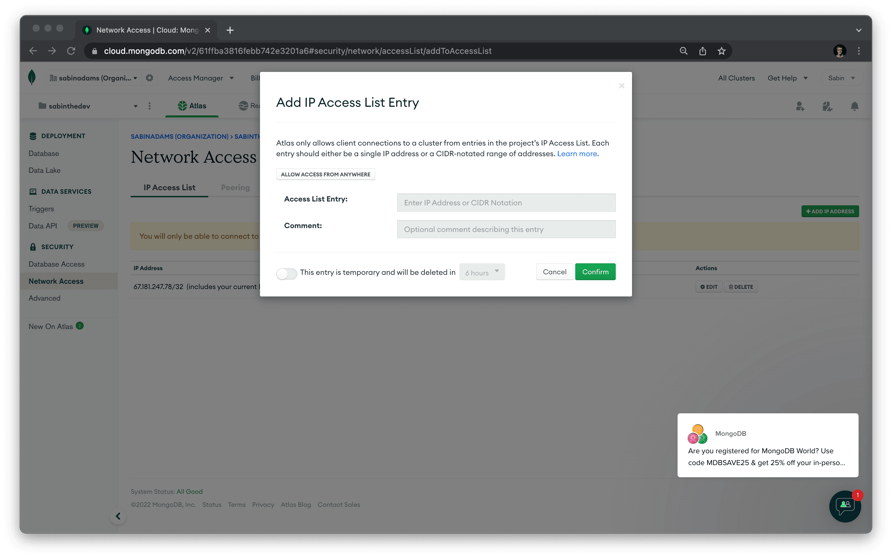 In this modal, hit the ALLOW ACCESS FROM ANYWHERE button and then hit the green Confirm button at the bottom.