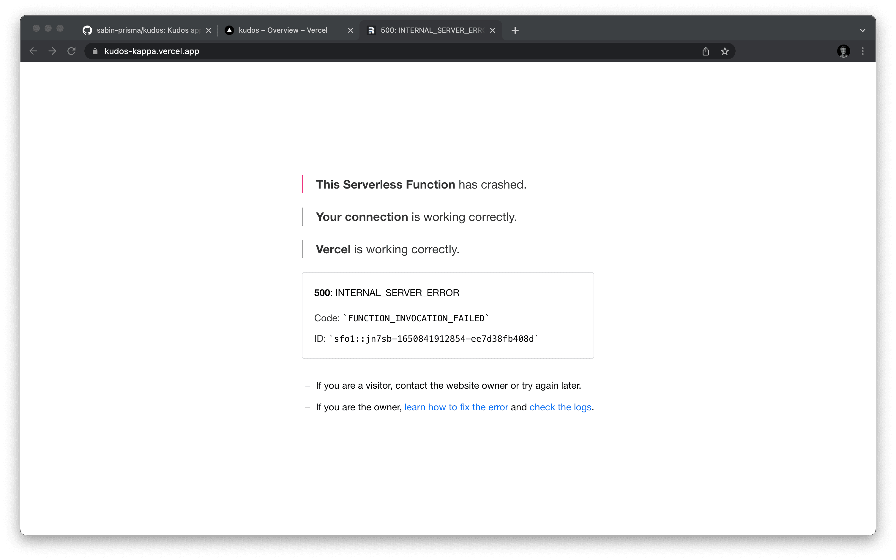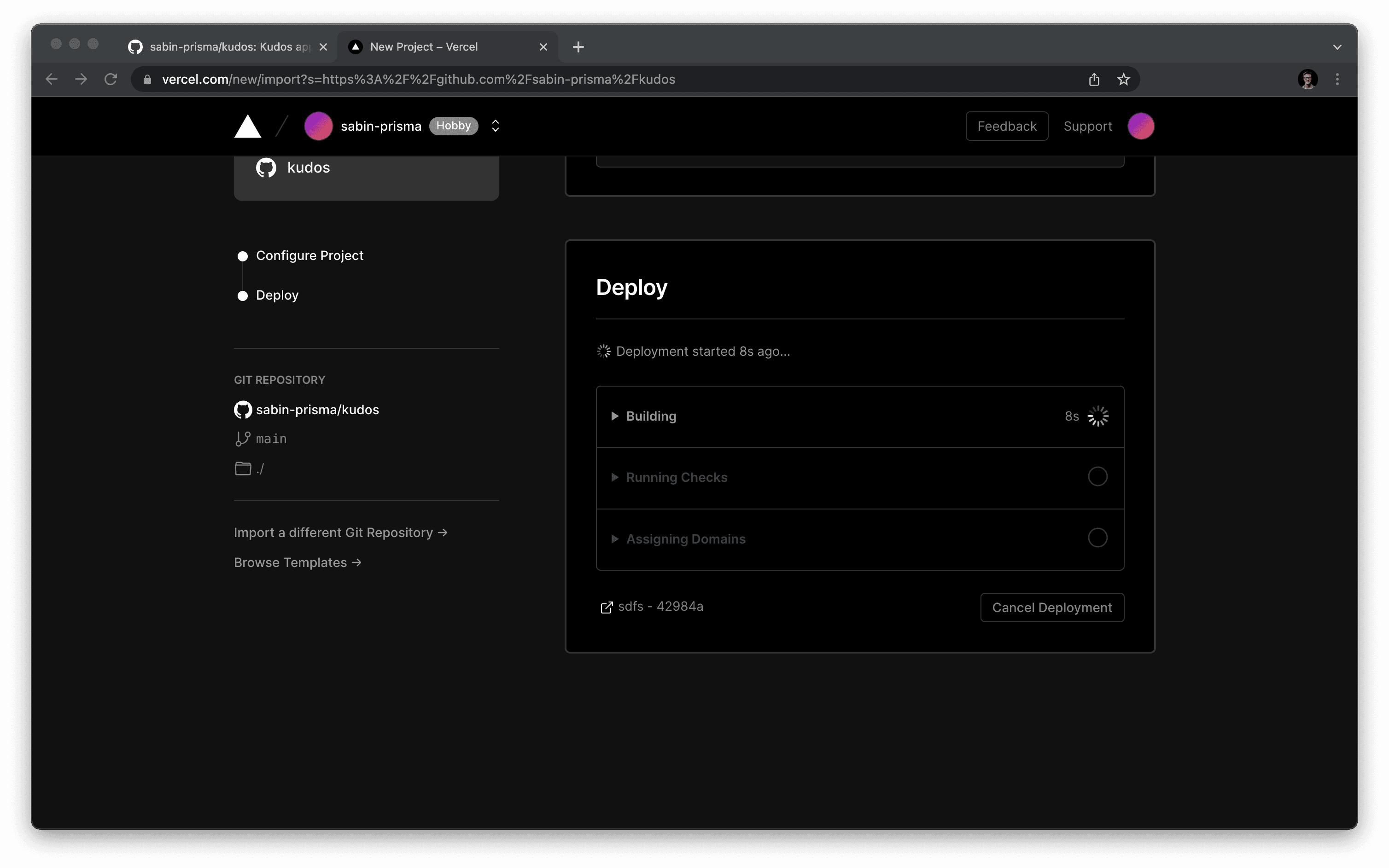 Clicking this button will kick off the application's build process, run any checks that need to be made, and deploy the application with a URL provisioned by Vercel.