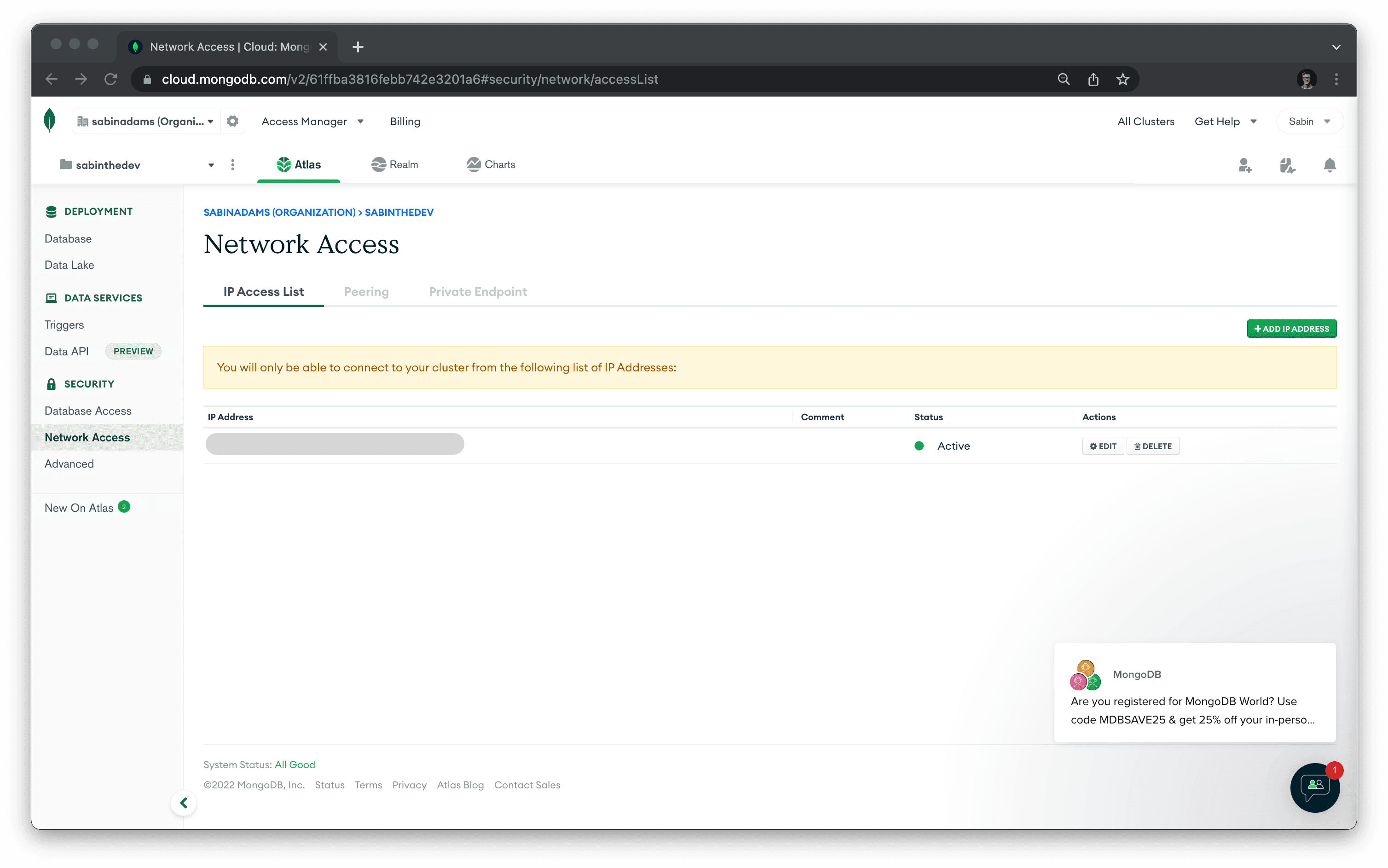 Open up the MongoDB dashboard and navigate to the Network Access tab on the left-hand menu.