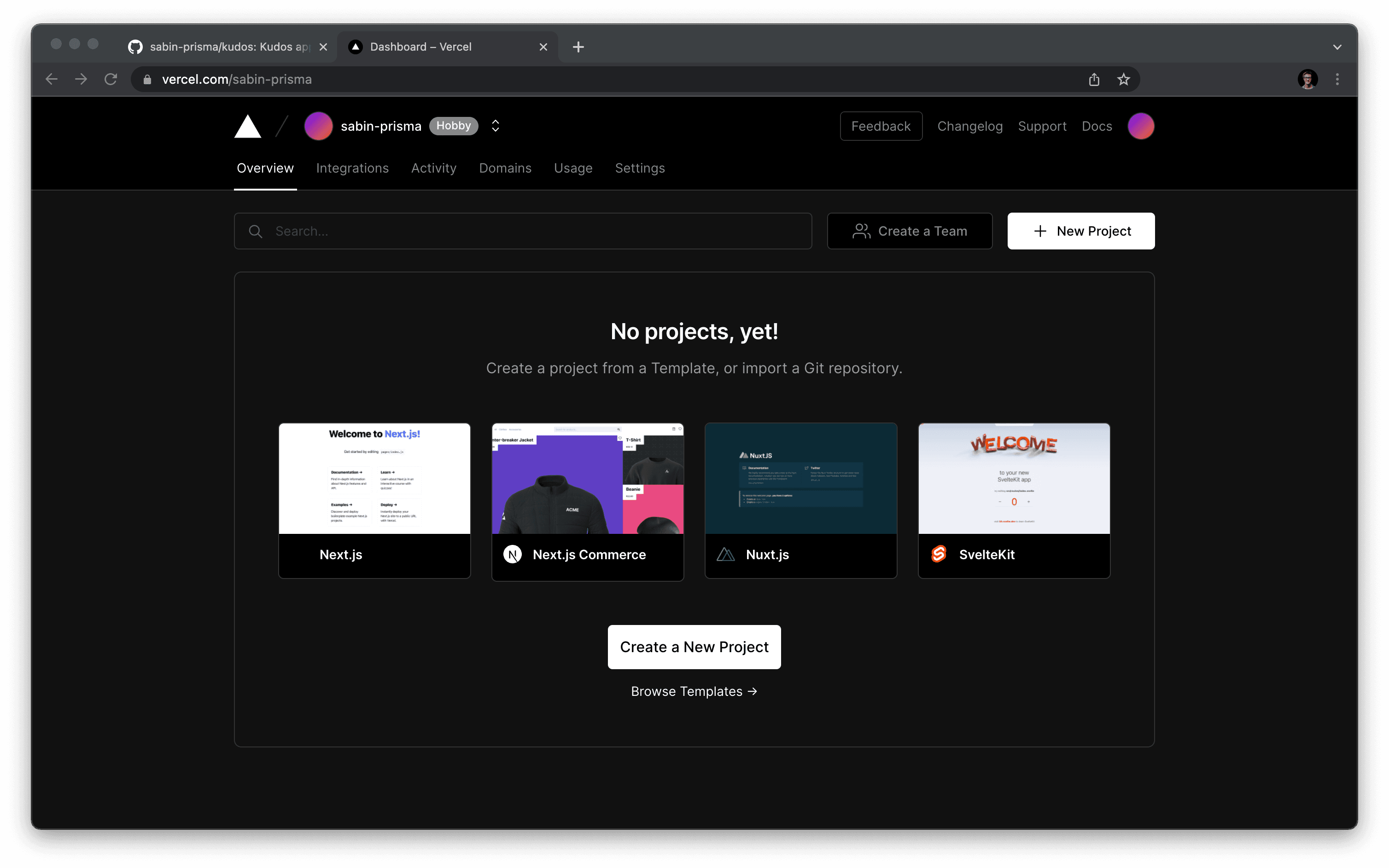 Next, log in to your account on Vercel. If you don't already have an account, the easiest option will be to sign up with your GitHub account.