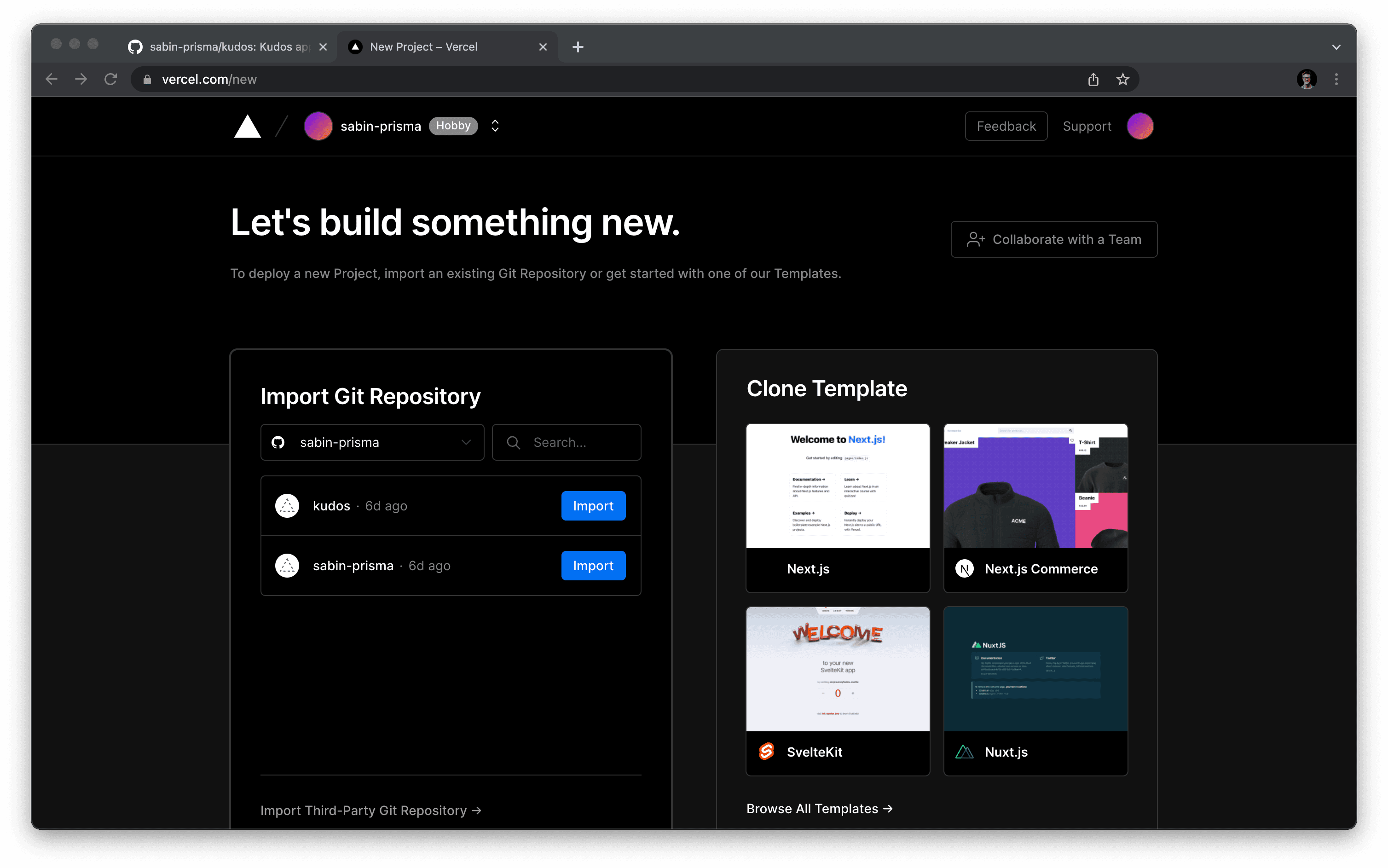 On this page you will be asked to import a GitHub repository or choose a pre-made template. If you haven't already linked your GitHub account to your Vercel account you will do so here as will.