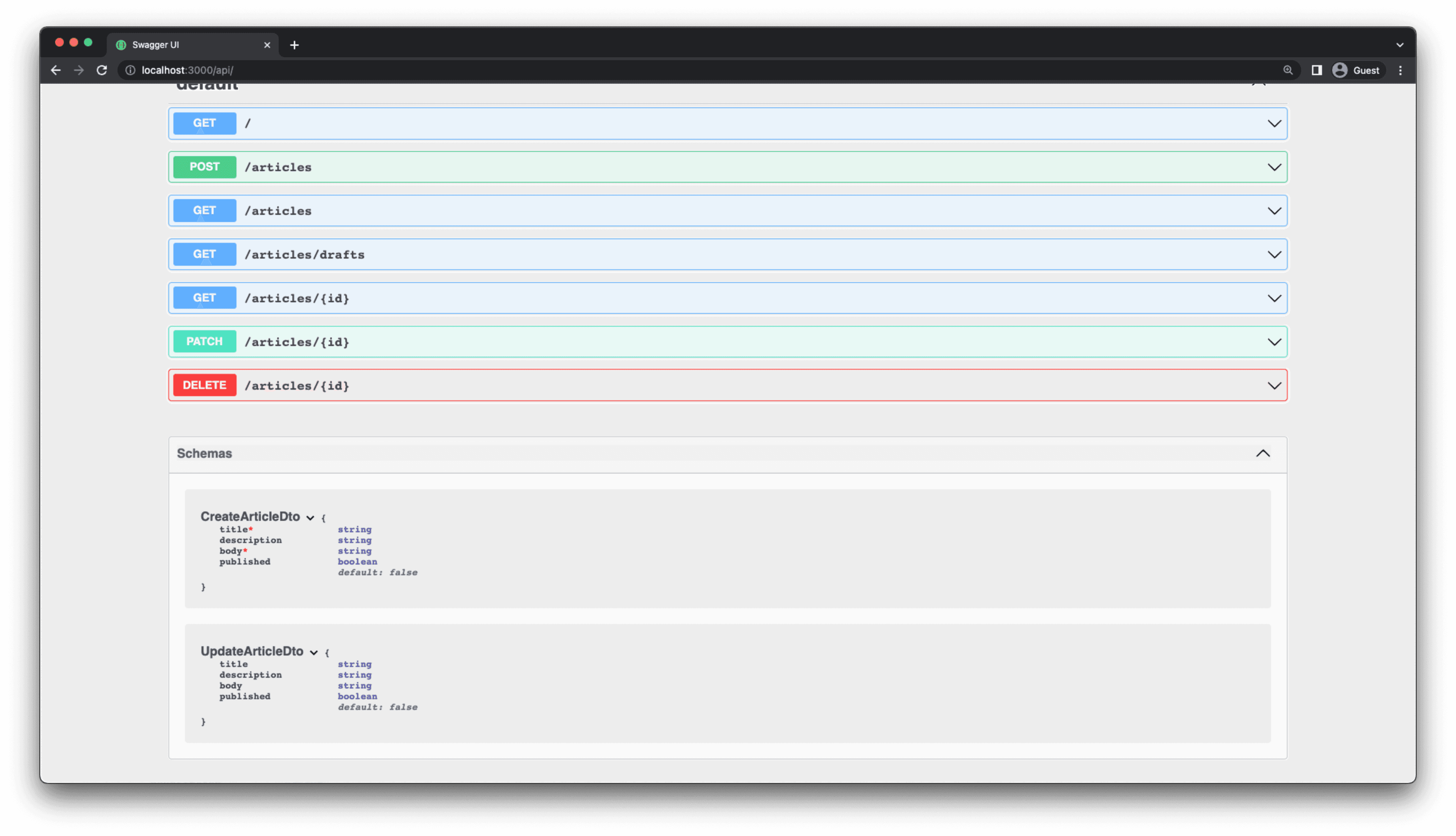 The CreateArticleDto should now be defined in the Swagger API page under Schemas. The shape of UpdateArticleDto is automatically inferred from the CreateArticleDto definition. So UpdateArticleDto is also defined inside Swagger.
