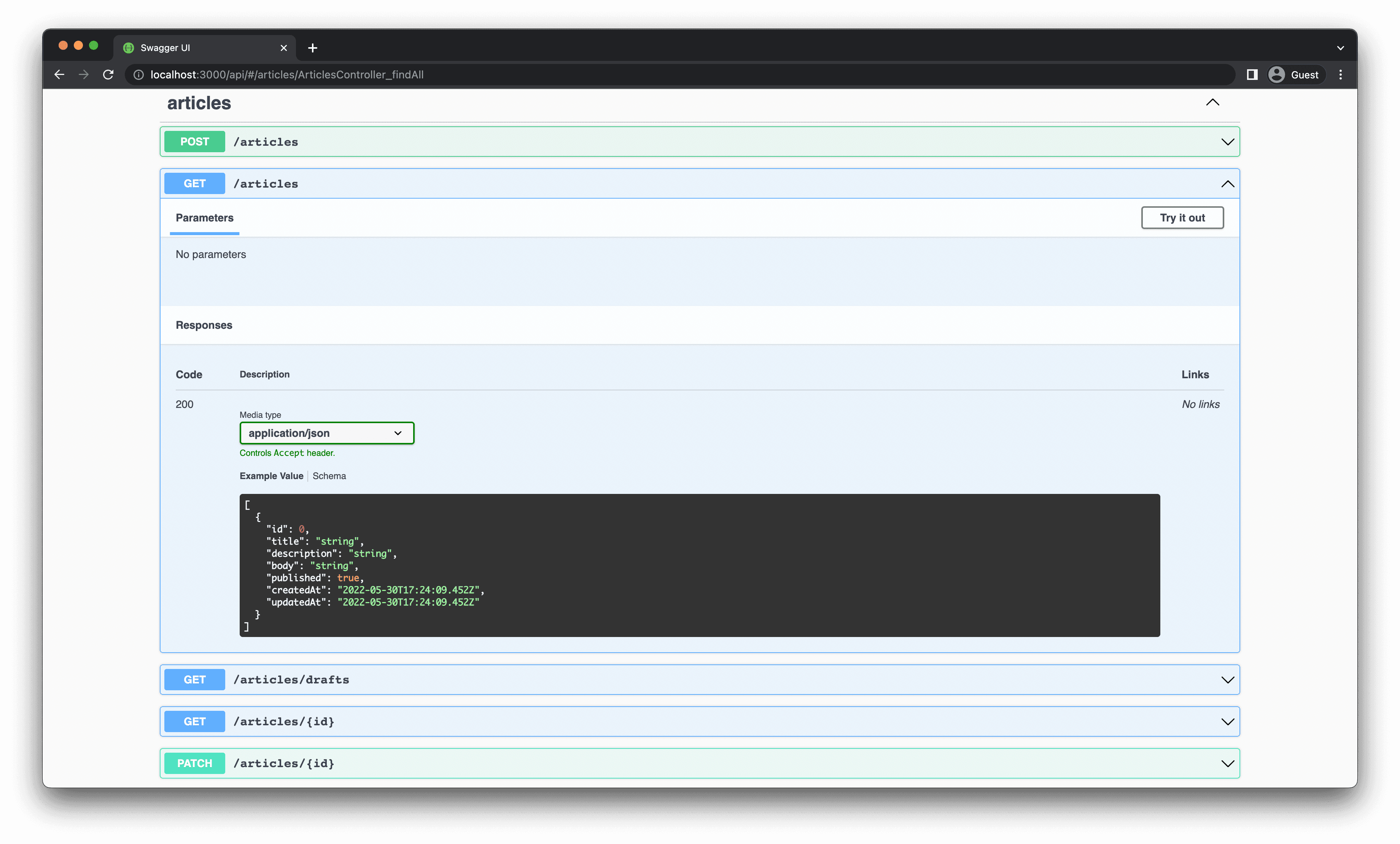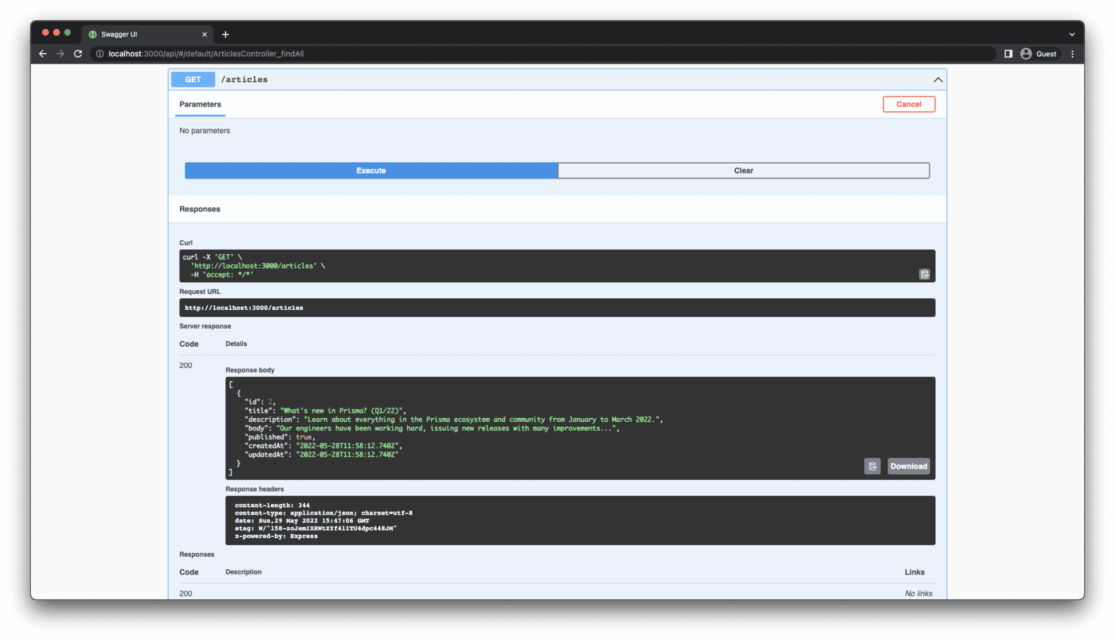 clicking on the GET/articles dropdown menu. Press Try it out and then Execute to see the result.