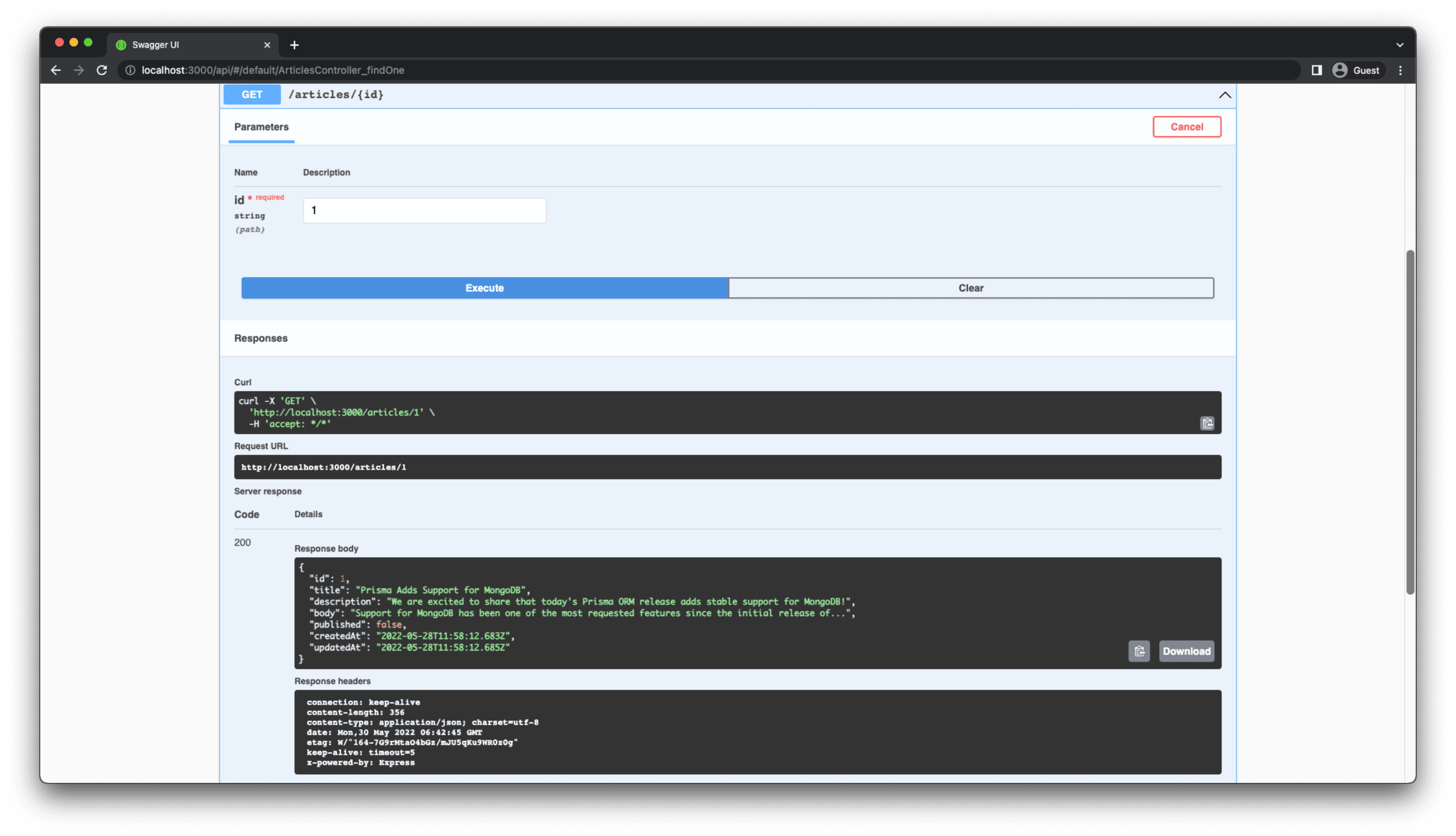 Once again, test out the endpoint by going to http://localhost:3000/api. Click on the GET /articles/{id} dropdown menu. Press Try it out, add a valid value to the id parameter, and press Execute to see the result.