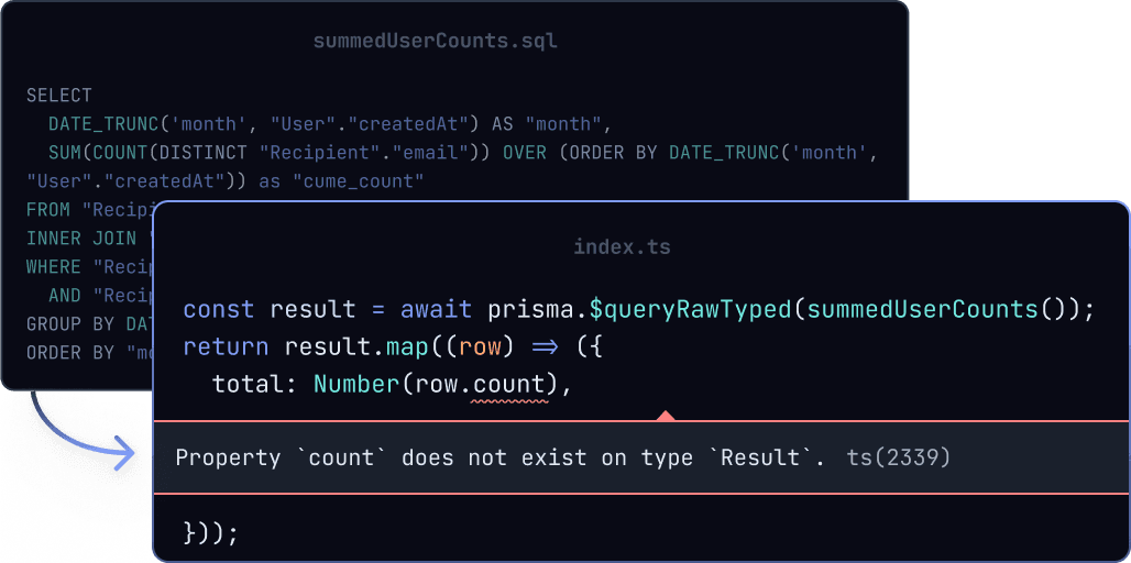 Execute SQL queries directly against your database without losing the benefits of Prisma’s type-checking and auto-completion. TypedSQL leverages the capabilities of Prisma Client to write raw SQL queries that are type-checked at compile time.