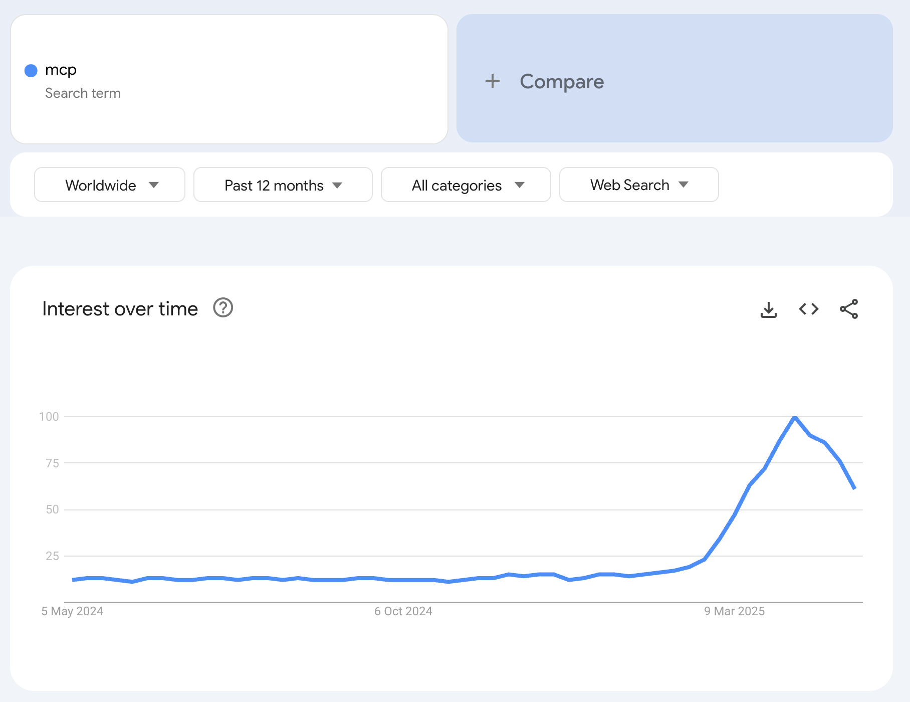 Anthropic clearly struck a chord with this standard. If you were on X at the time, you probably saw multiple MCP posts a day. Google Trends for "MCP" tell the same story: