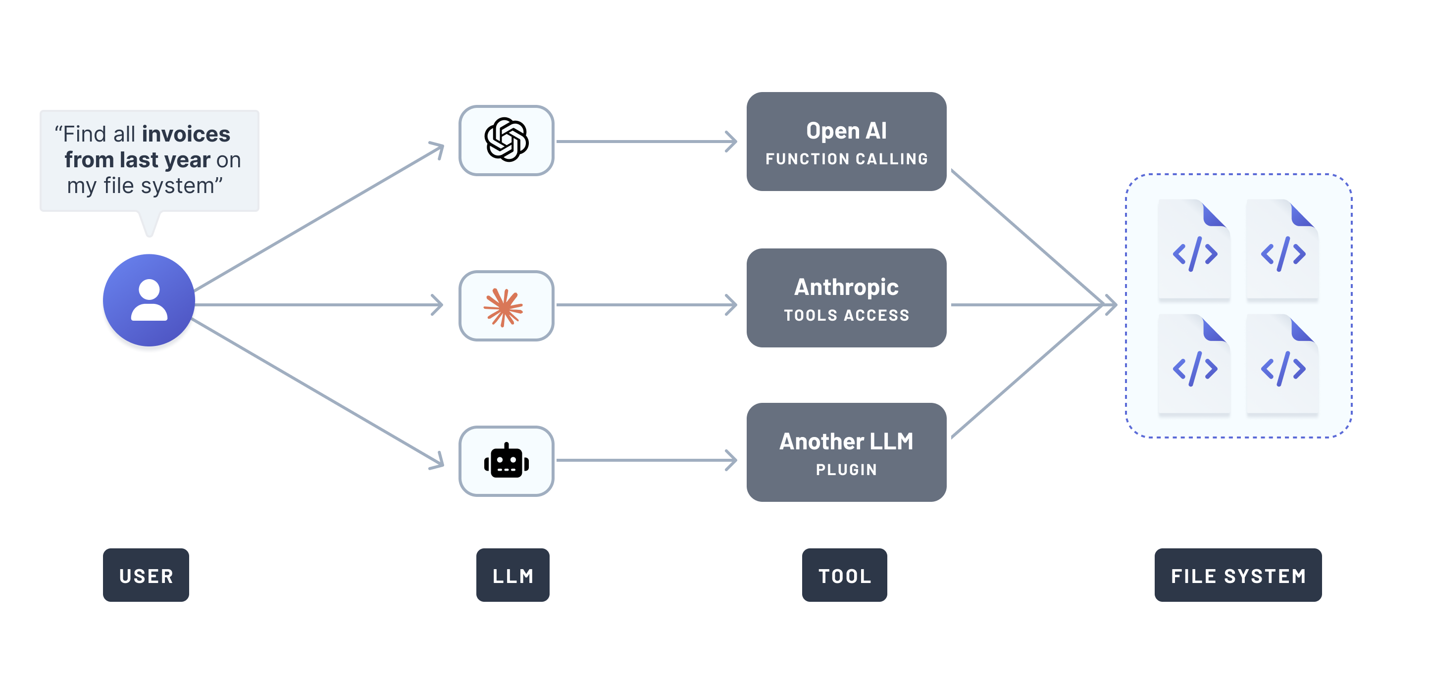 For example, if you wanted multiple LLMs to access your file system, you would need to implement the same "file system access tool" multiple times, each tailored to a specific LLM. Here's what that might have looked like: