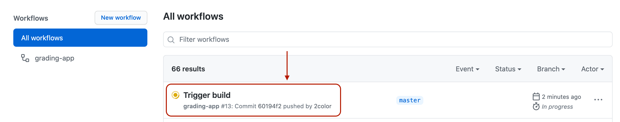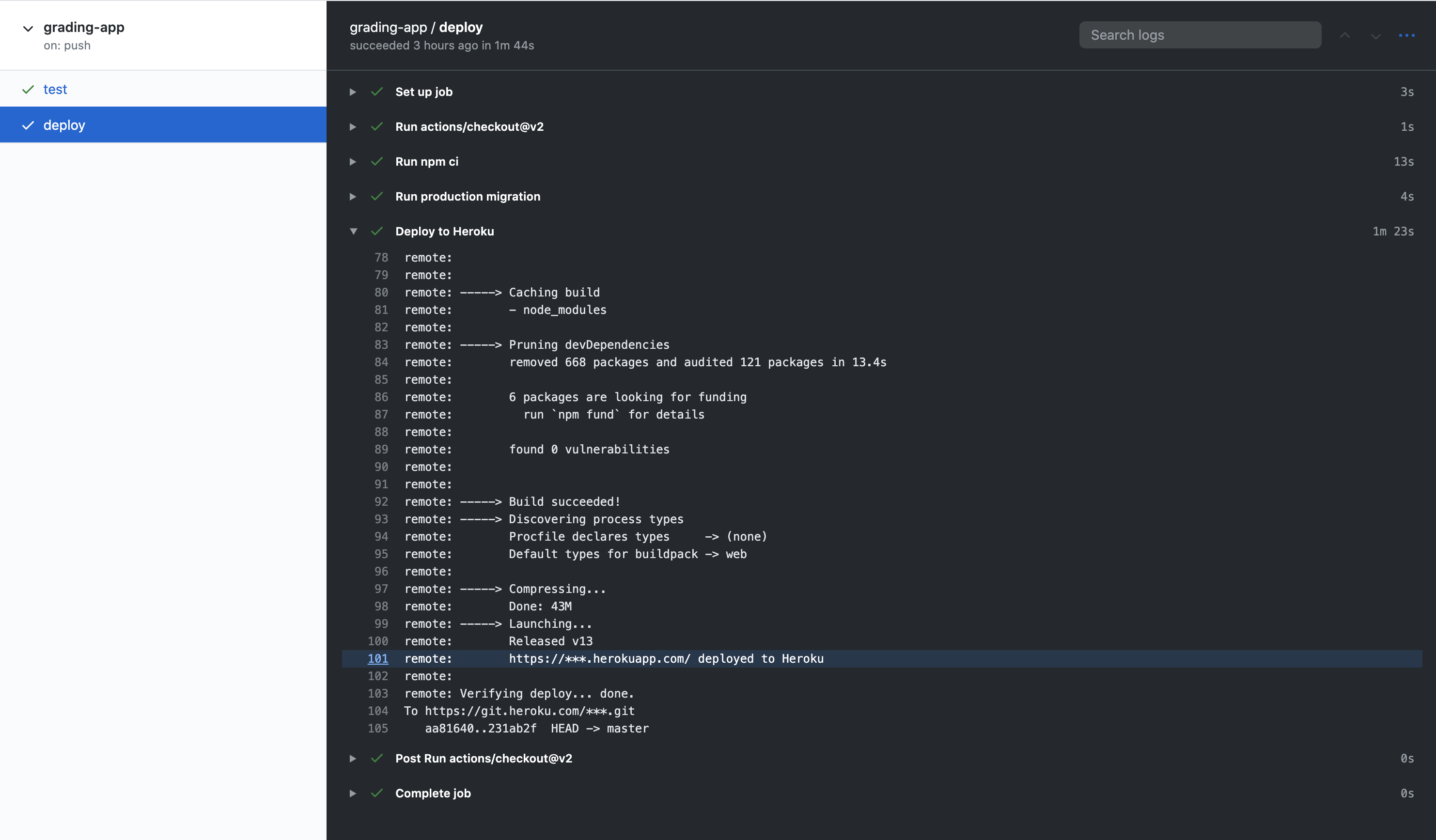 heroku_email: ${{ secrets.HEROKU_EMAIL }}The grading-app workflow has two jobs: test and deploy.