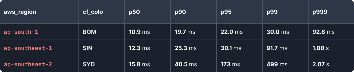 Fastest of all, ap-south-1 (Mumbai) opened in 2016 and has a p50 latency to the nearby Cloudflare BOM PoP of 10.9ms. Second, ap-southeast-1 (Singapore) opened in 2010 and has a p50-latency to the nearby SIN PoP of 12.3 ms. Finally, the ap-southeast-2 (Sydney) region opened in 2012 and has a p50 latency of 15.8ms to the nearby SYD PoP.
