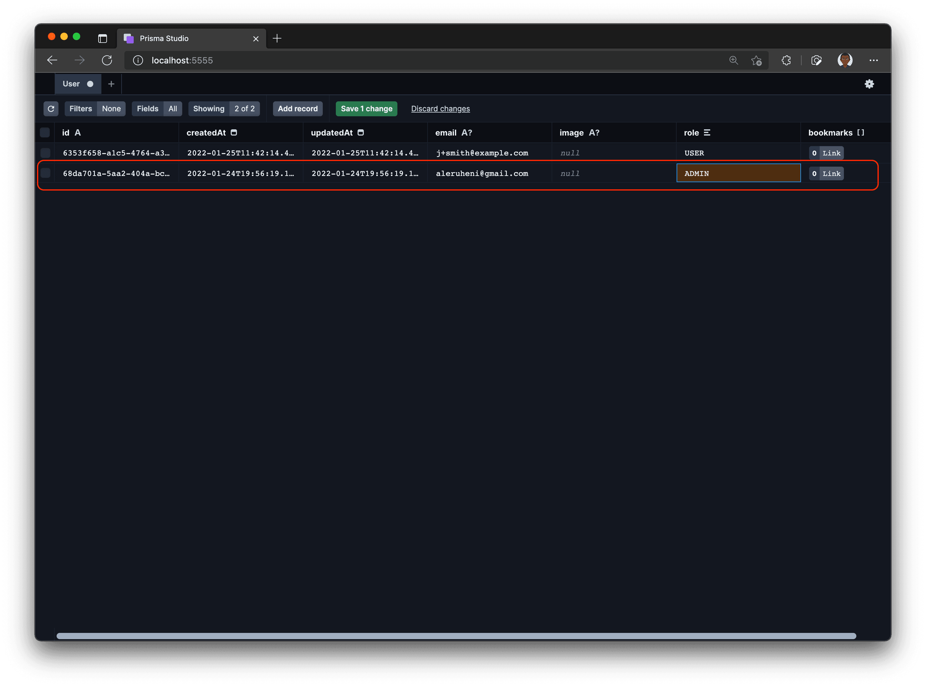 First start Prisma Studio by running npx prisma studio in the terminal. Then click the User model and find the record matching the current user. Now, go ahead and update your user role from USER to ADMIN. Save your changes by pressing the Save 1 change button.