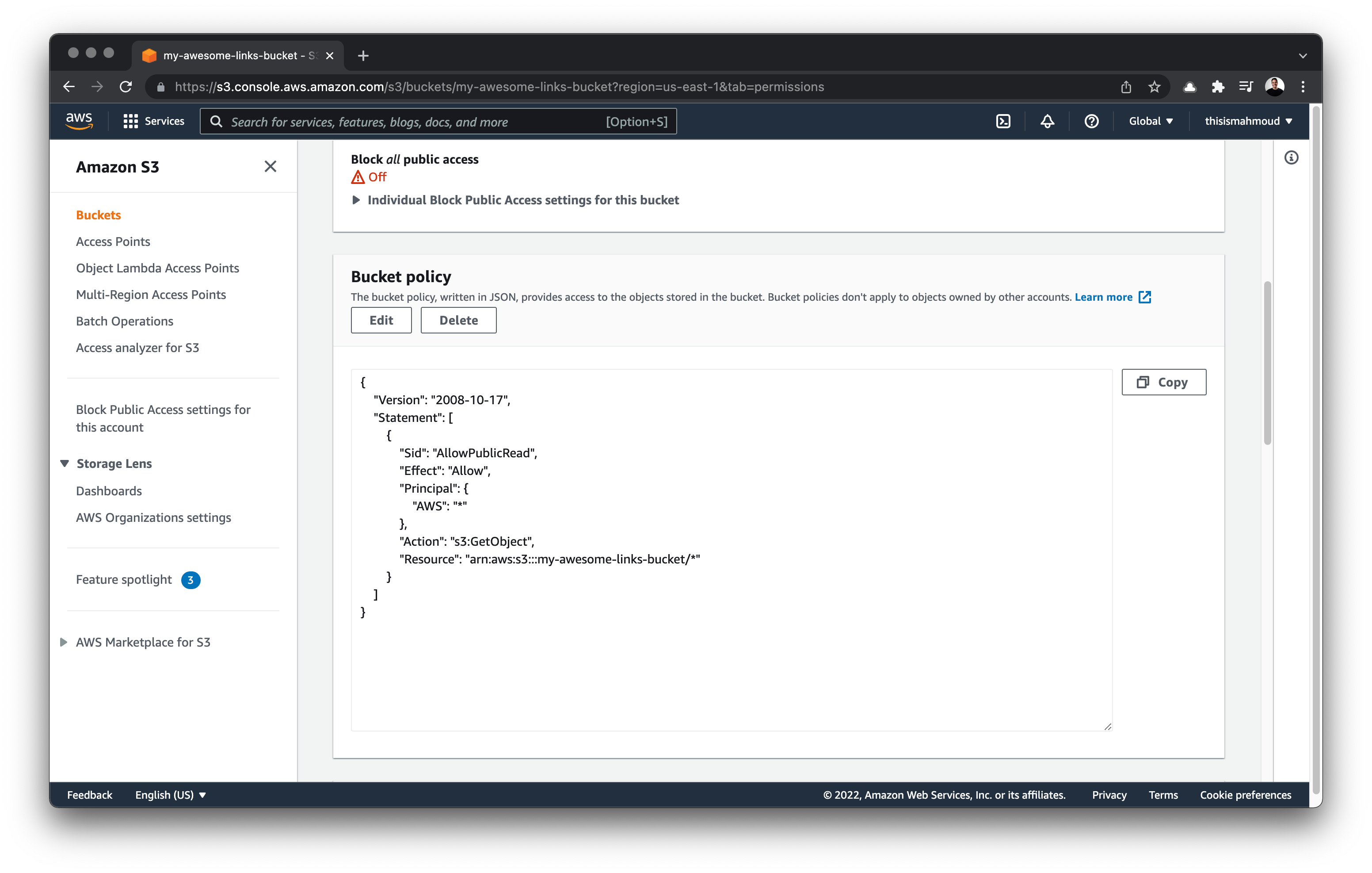 Next, update the resource policy to grant the application access to the Bucket and its contents. In the Permissions of your S3 Bucket, navigate to the Bucket policy section. Select Edit and add the following while changing "name-of-your-bucket" placeholder to the name of your Bucket: