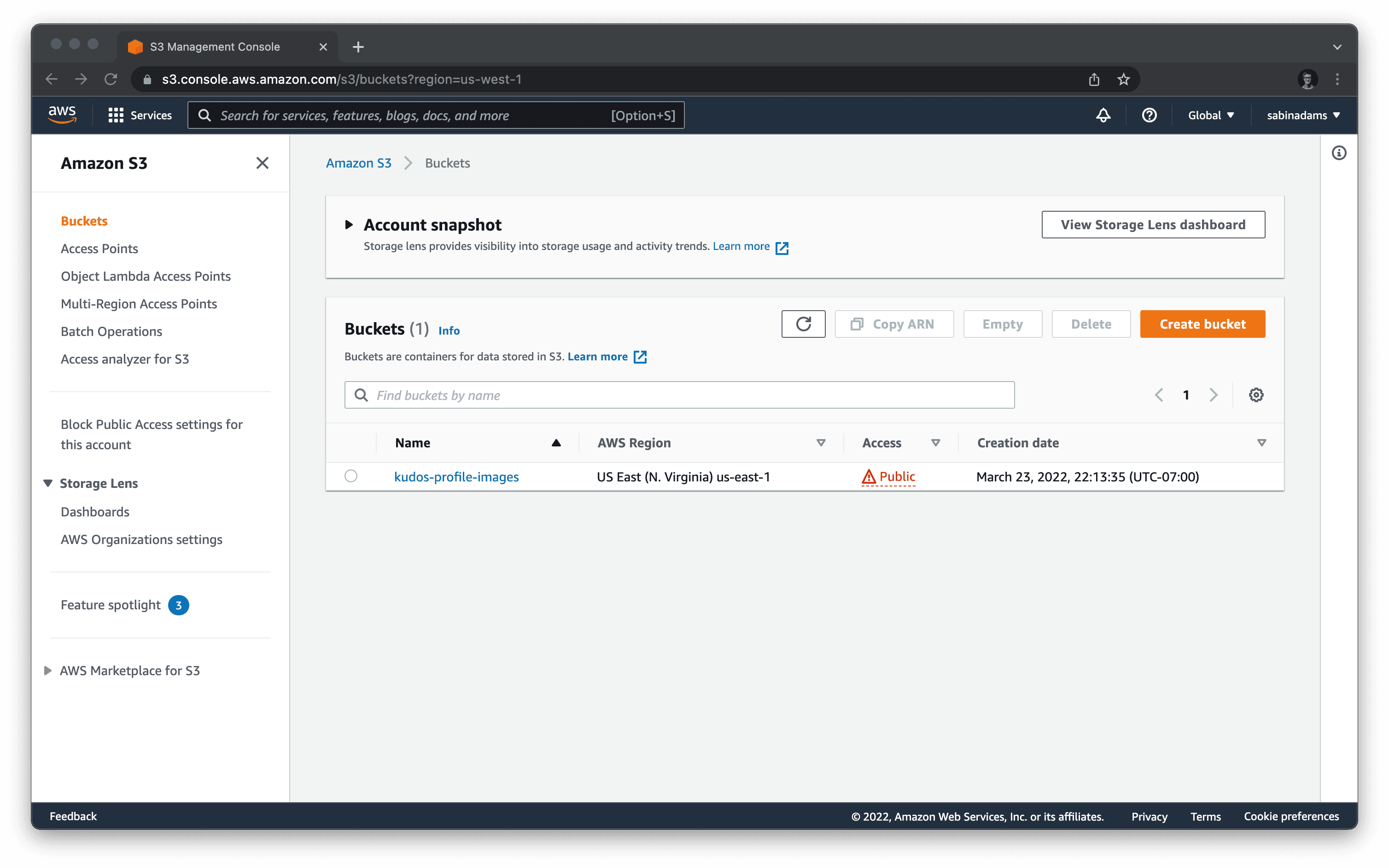 Now that you have a user and access keys, head over to the AWS S3 dashboard where you will set up the file storage bucket.