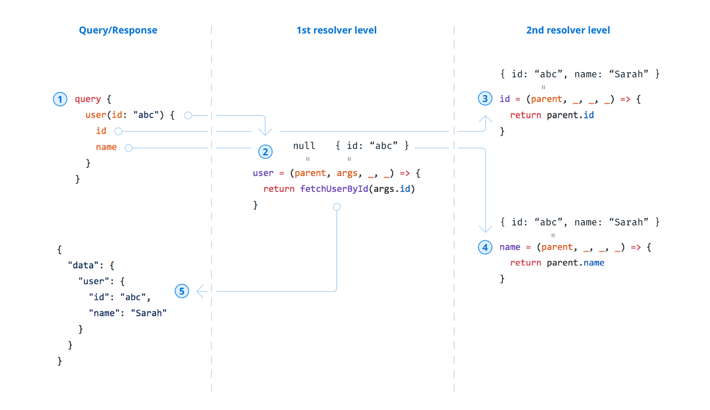 Here is an overview of the execution process of a simple GraphQL query and the invocations of the belonging resolvers. Because the resolution of the 2nd resolver level is trivial, there is no need to actually implement these resolvers — their return values are automatically inferred by GraphQL.js: