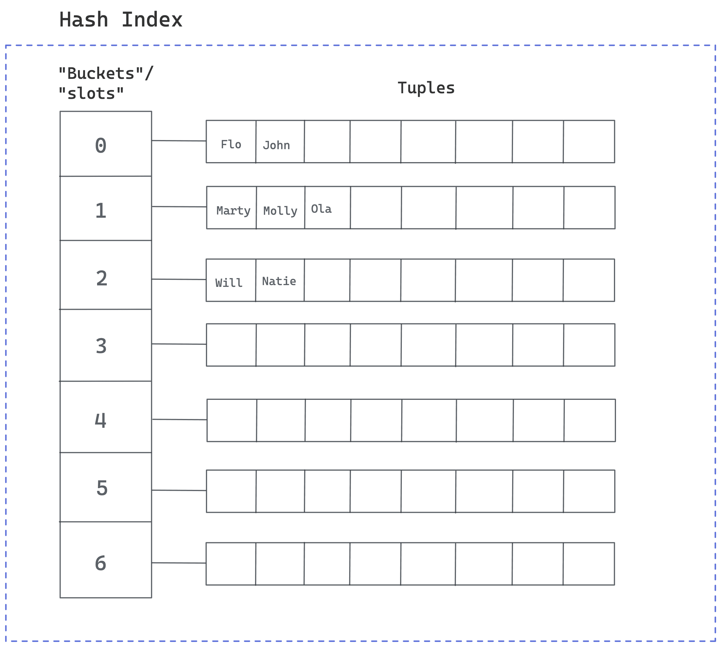 PostgreSQL's hash index is composed of "buckets" or "slots" into which tuples are placed.
