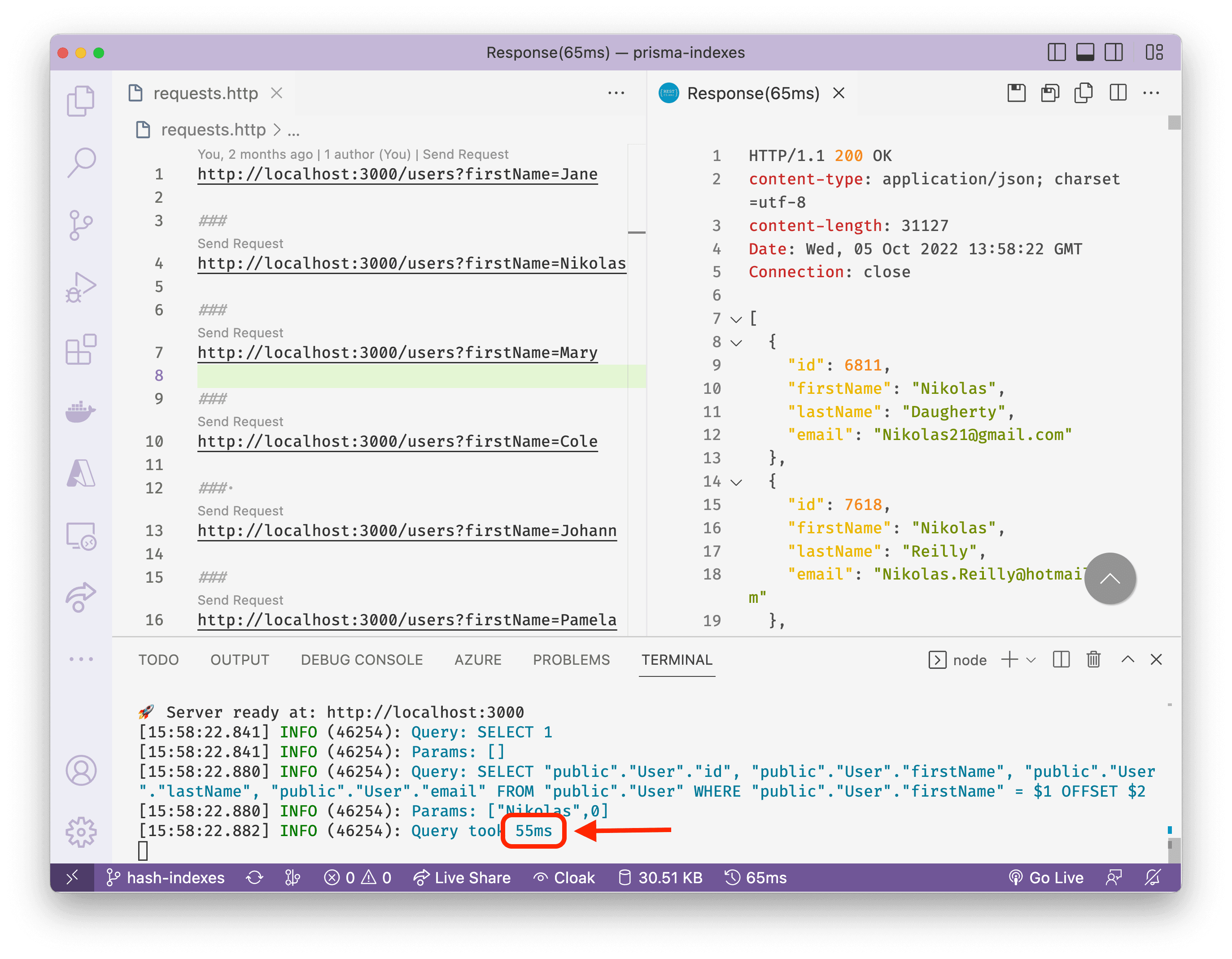 Next, navigate to the requests.http file again and resend the requests to the /users route.