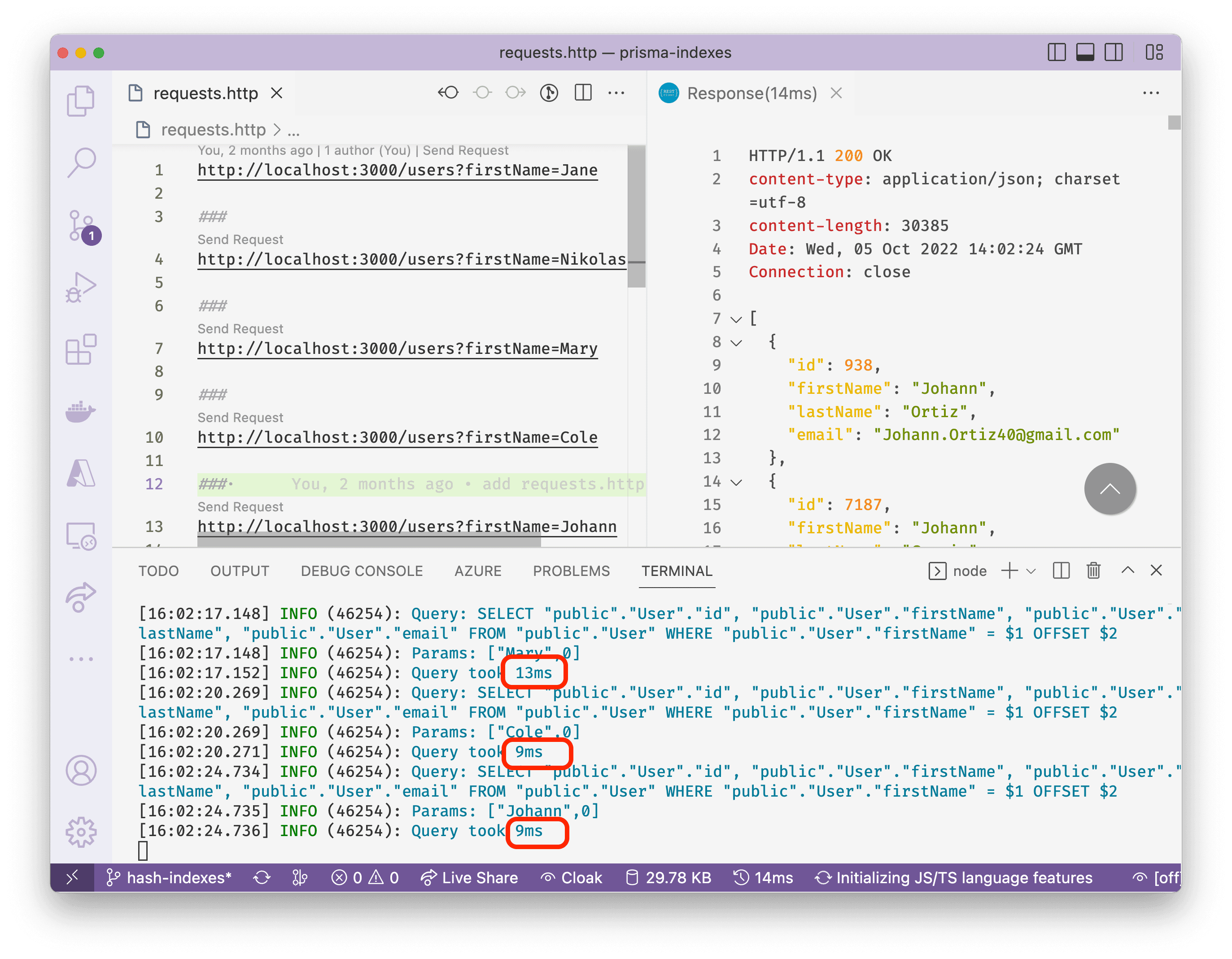 The cloned repository contains a requests.http file that contains sample requests to http://localhost:3000/users that can be used by the installed REST Client VS Code extension. The requests contain different firstName query parameters.
