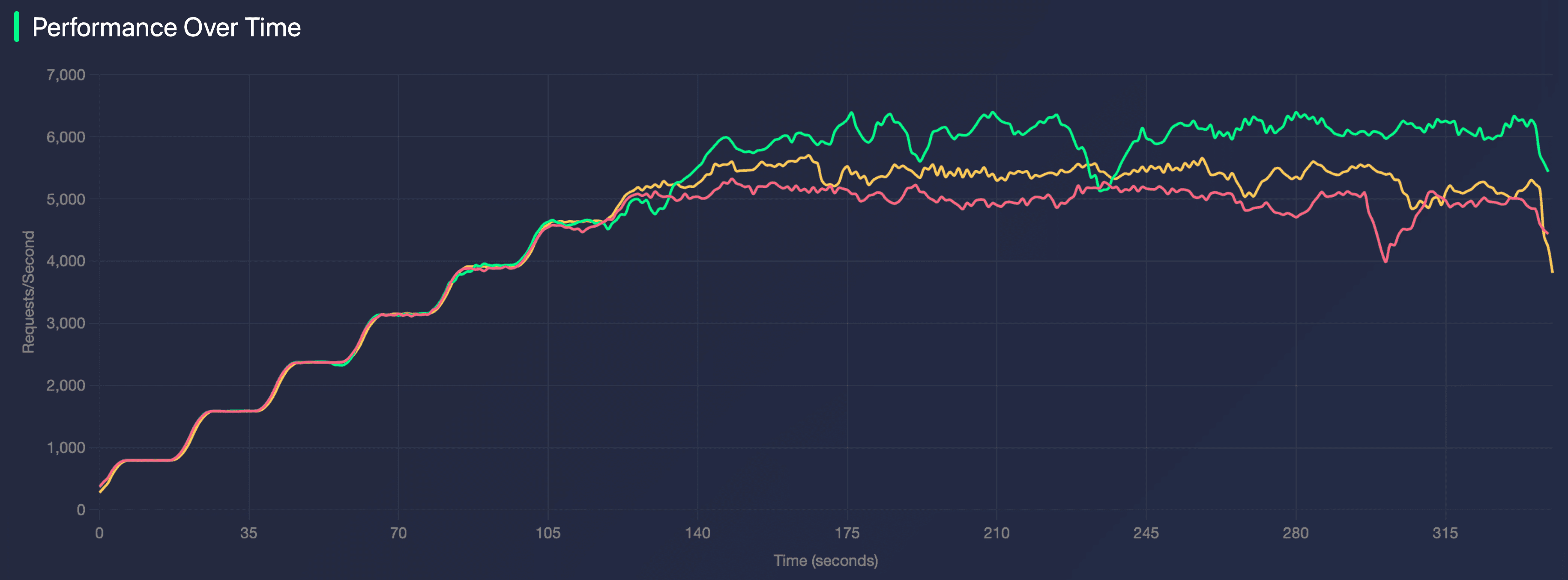 Here, we’re measuring requests per second. At the start, all three versions of Prisma ORM perform about the same. However, at a certain point, v6 and v7.3.0 begin to run into issues. v7.4.0, however, is able to handle more requests than both v6 and v7.3.0.