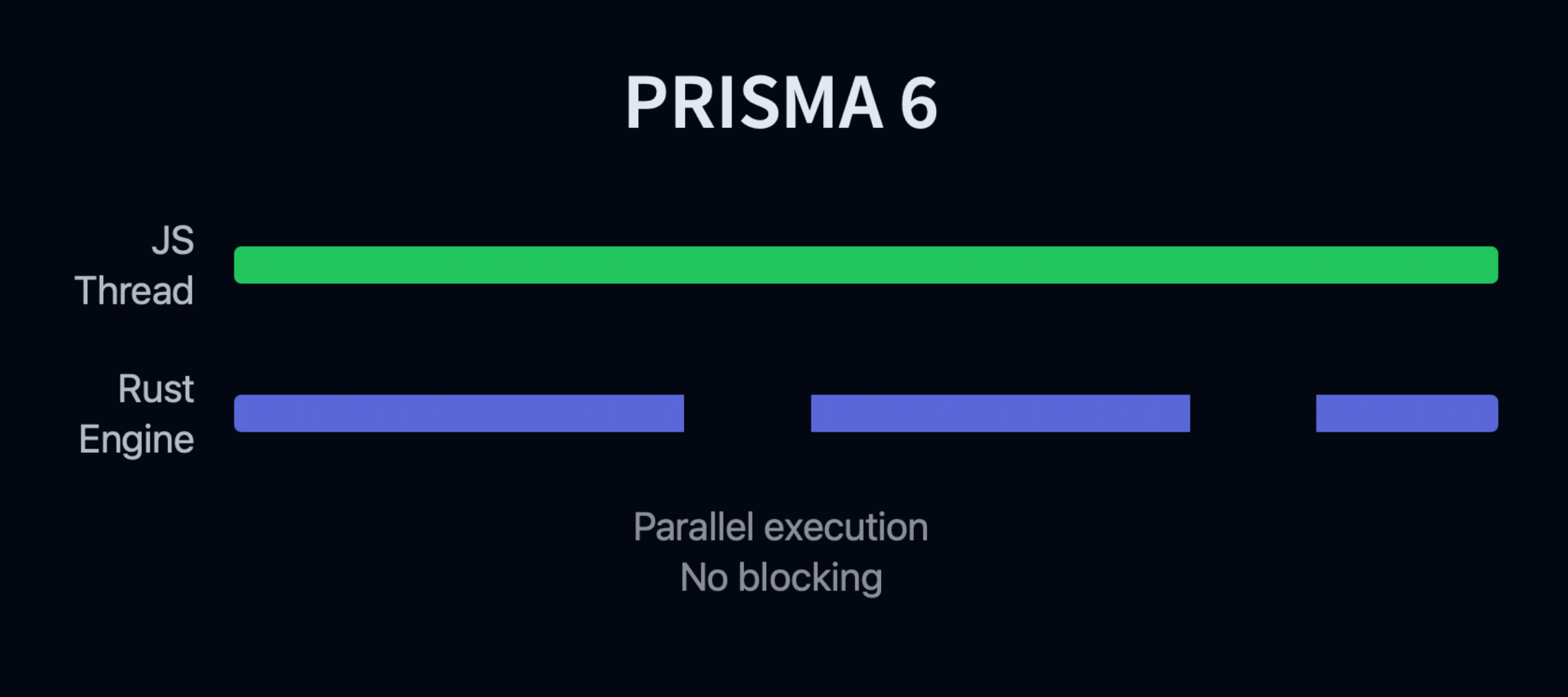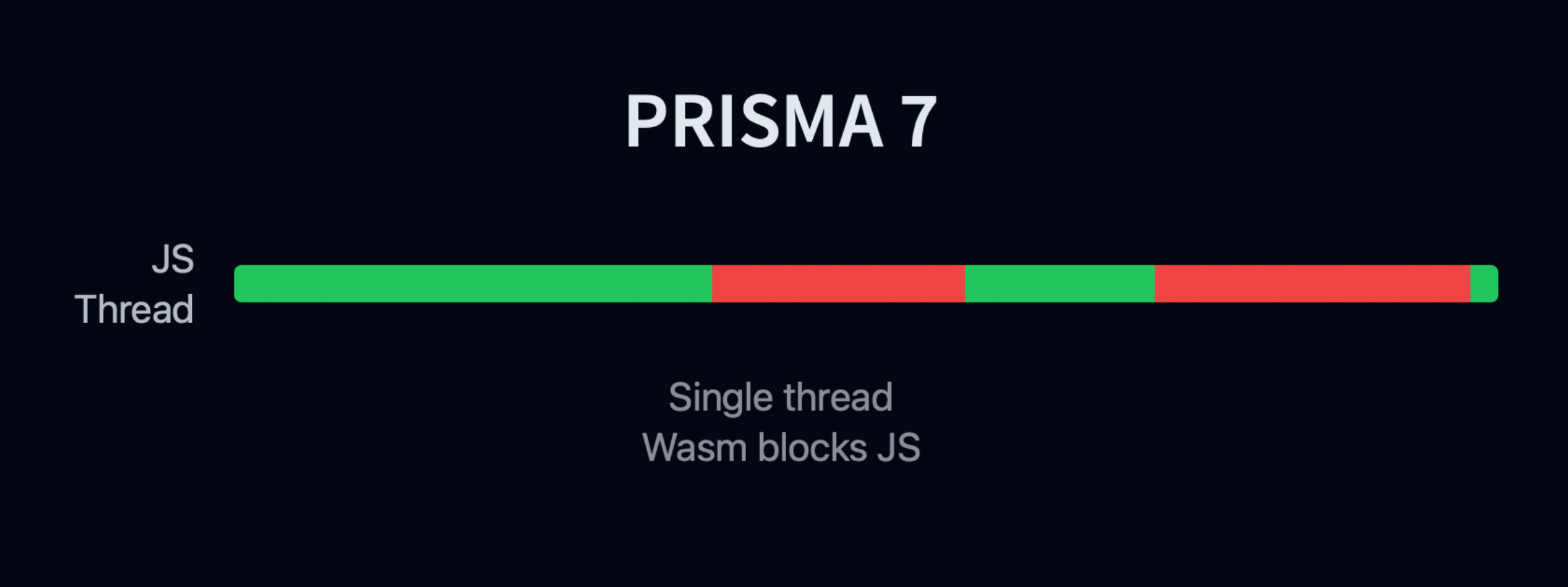 With v7 moving to a WASM module approach, serialization became faster, but more work moved onto the main thread. Now, every time a query is performed, a small amount of blocking occurs in order to take your Prisma ORM query and build the appropriate SQL statement.