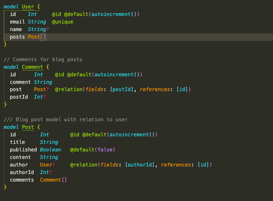 The Prisma schema language tries to strike the right balance between being self-explanatory and expressive. Self-explanatory means that even with no familiarity, you can still comprehend the data model, and expressive –in this context– means that you can effectively design your desired database schema without falling back to raw SQL (with relational databases).